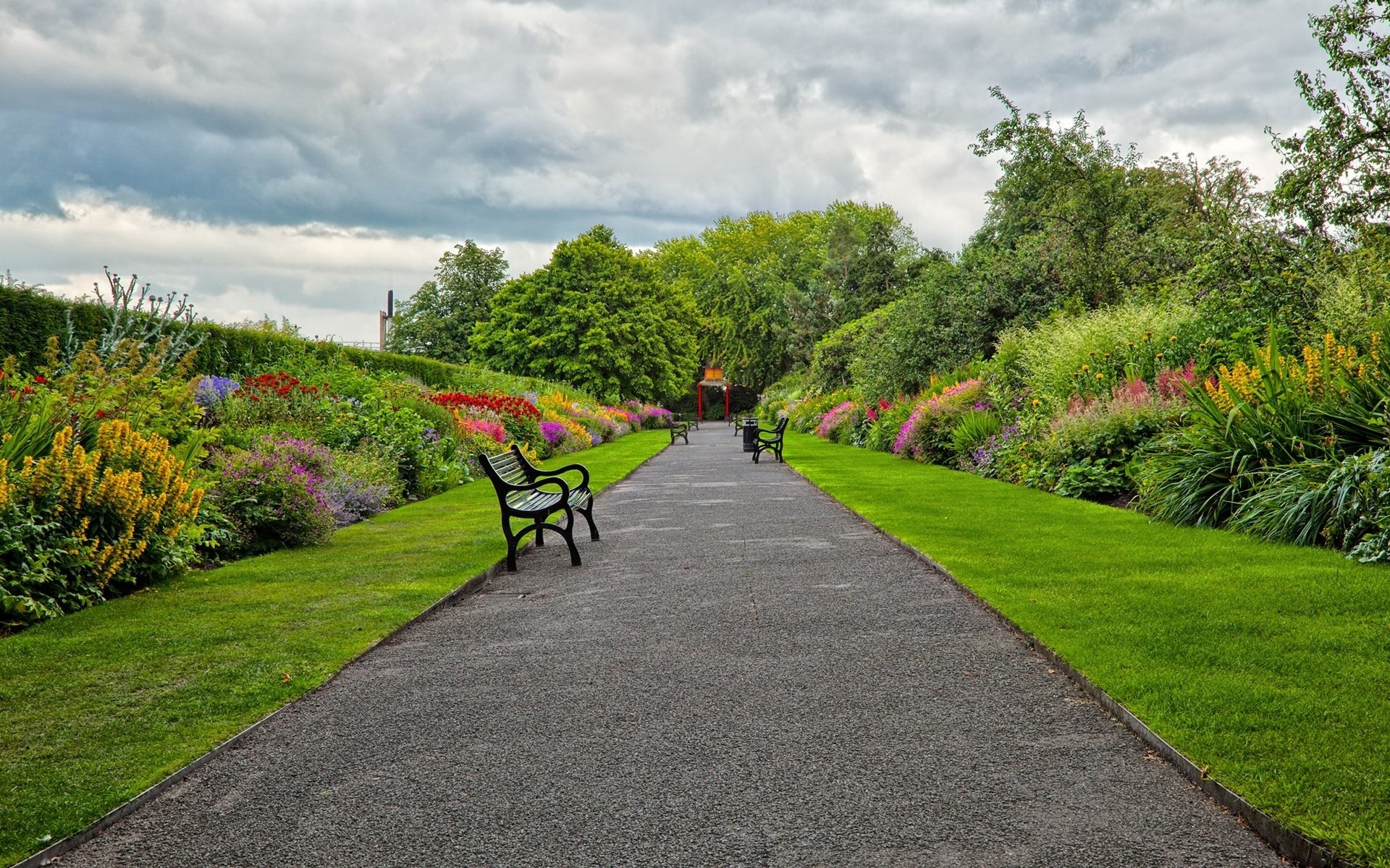 Скачать обои для рабочего стола Цветущая аллея со скамeйками и фото
