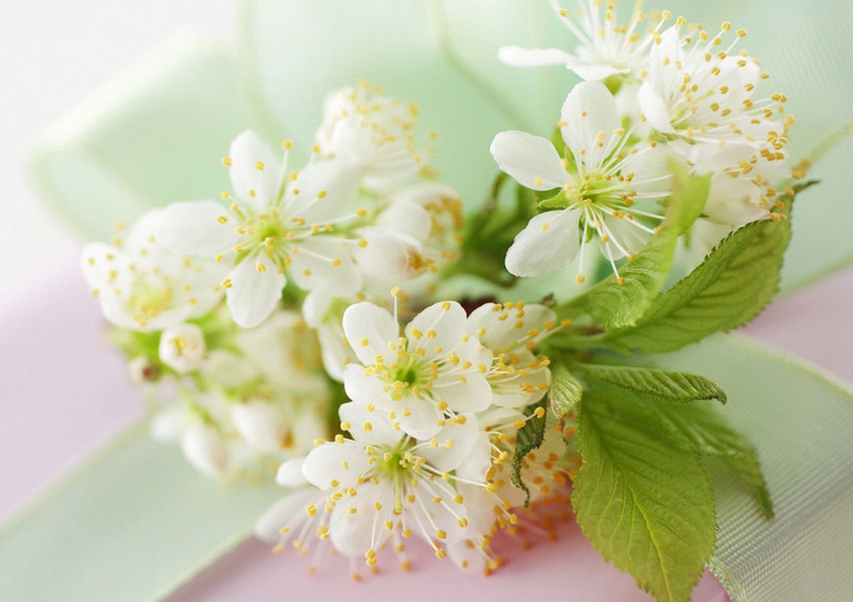 Скачать обои для рабочего стола Цветущая веточка лежит на столе и фото