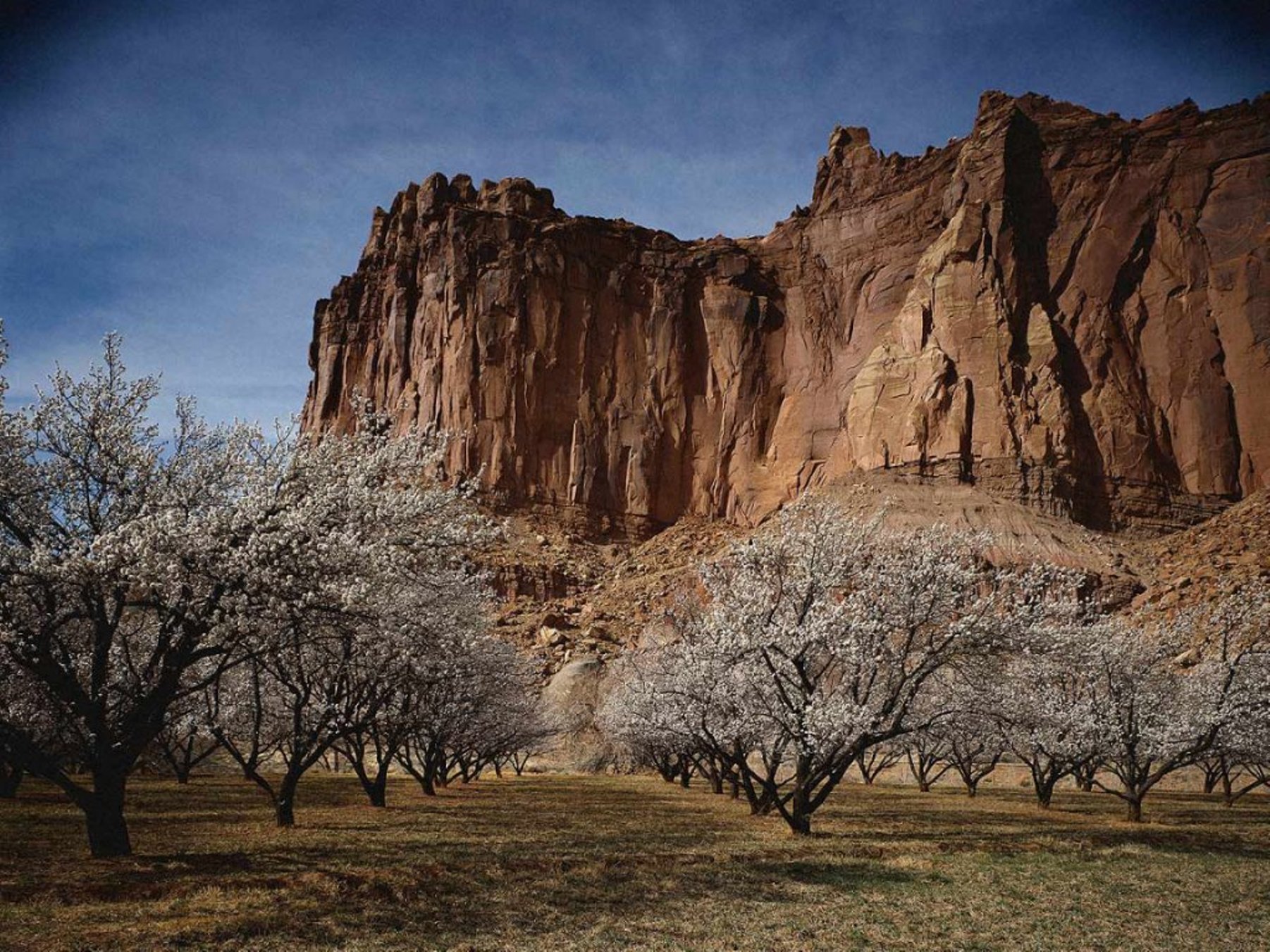Скачать обои для рабочего стола Цветущие деревья и горы и фото
