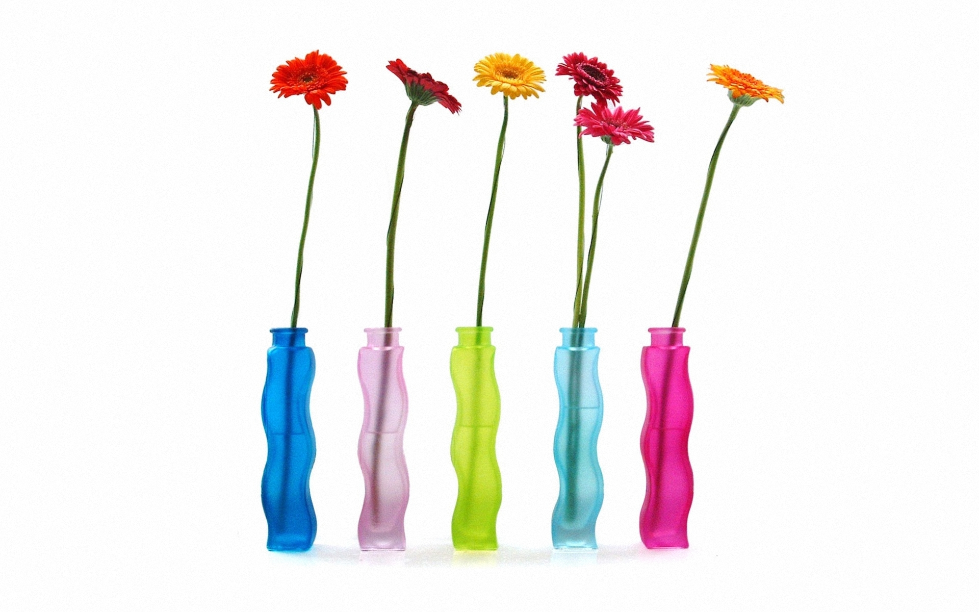 Скачать обои для рабочего стола Цветы в разноцветных бутылочках и фото