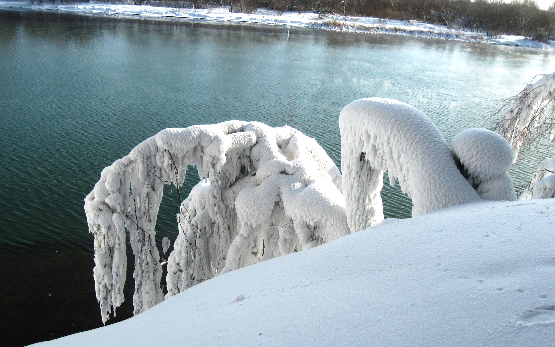 Скачать обои для рабочего стола Деревья в снежных шубах склонились над рекой и фото
