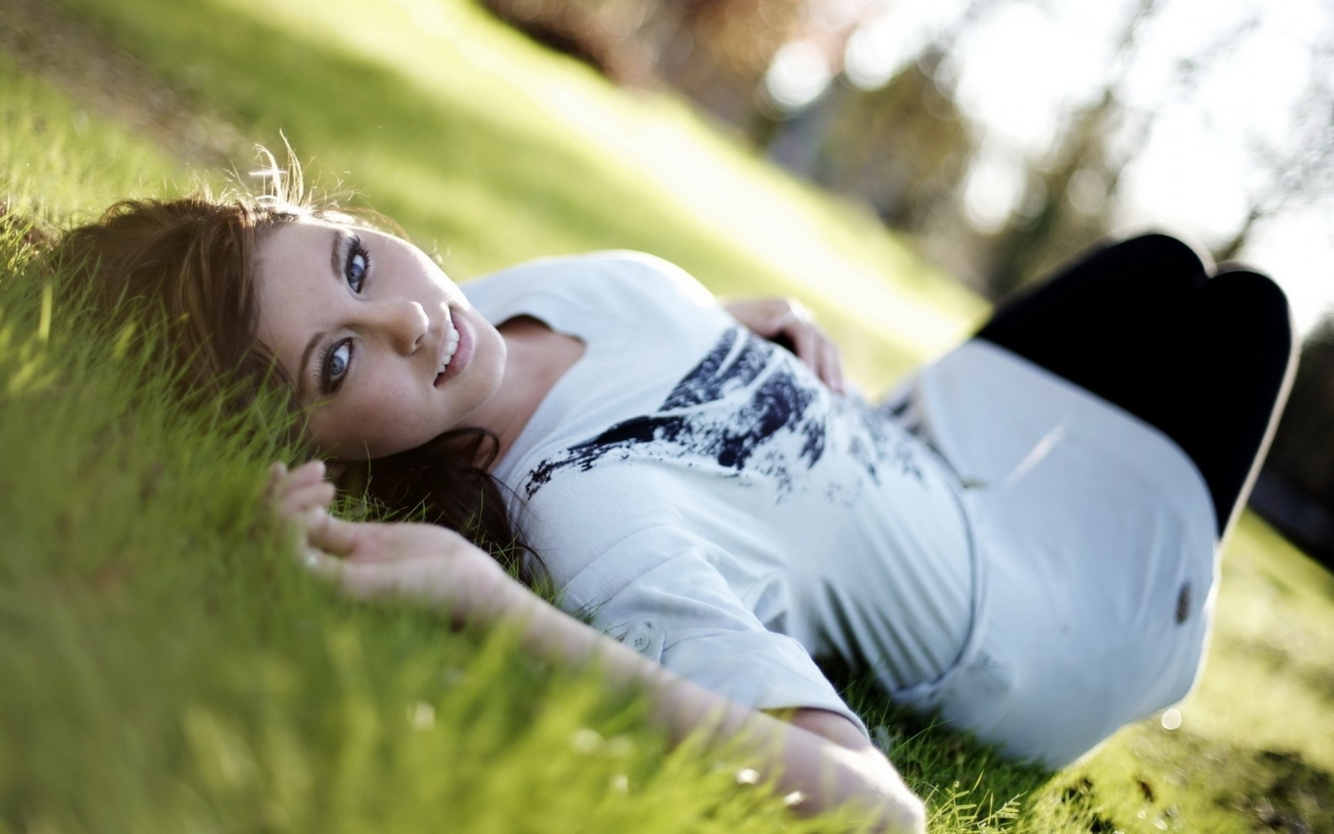 Скачать обои для рабочего стола Девчонка с серыми глазами отдыхает на траве и фото