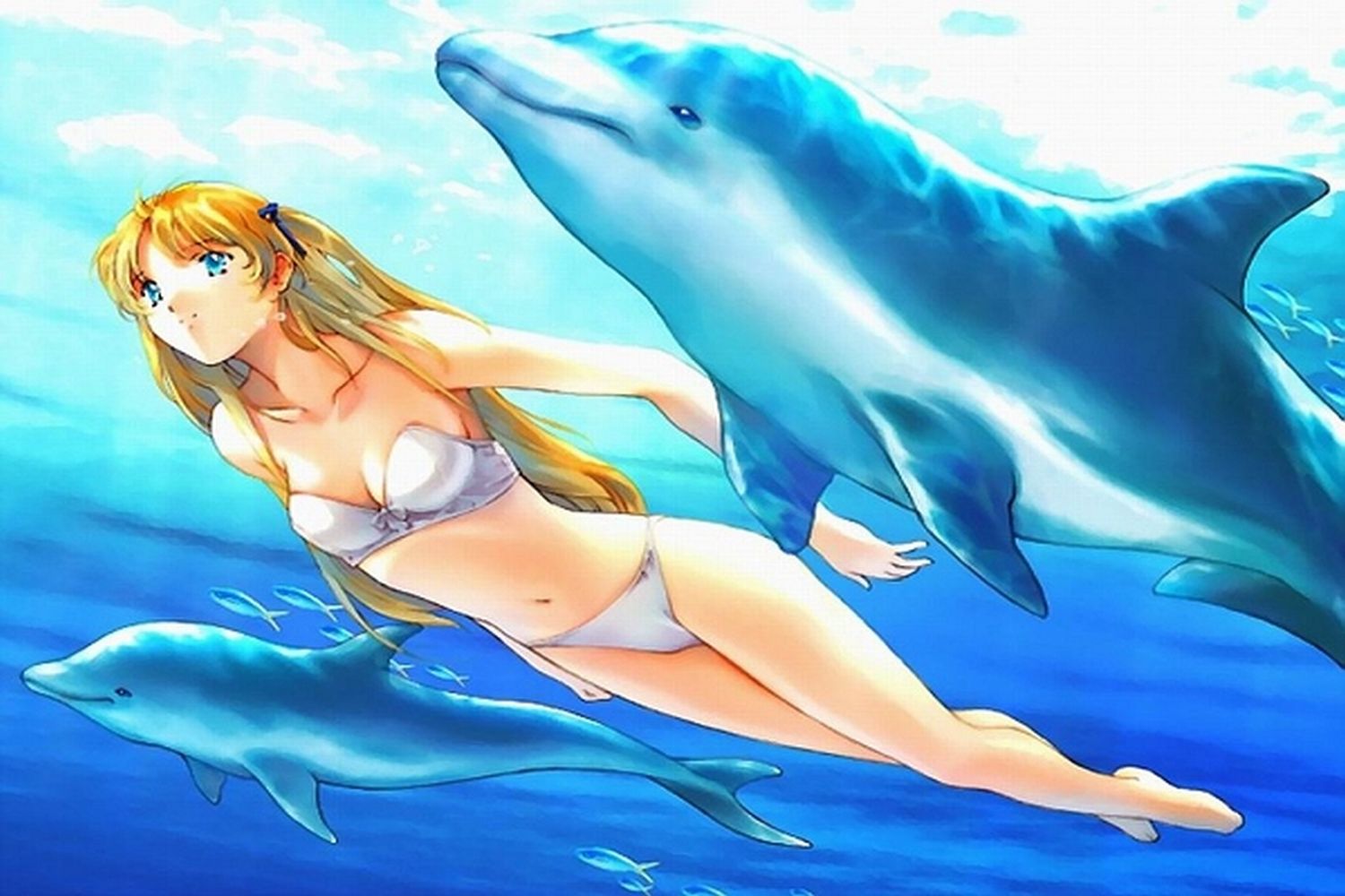 Скачать обои для рабочего стола Девочка и дельфины и фото
