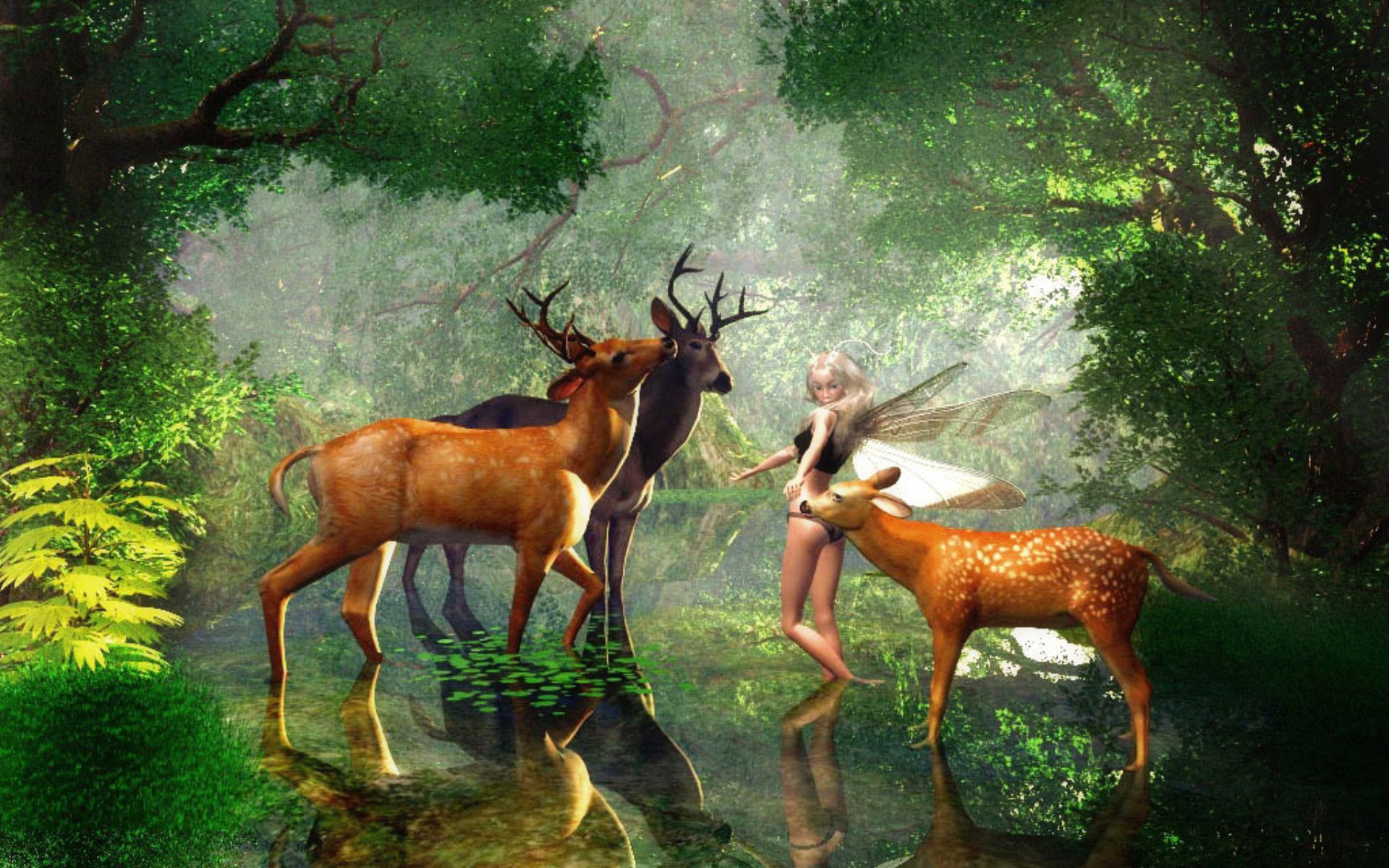 Скачать обои для рабочего стола Девочка-мотылек и олени и фото