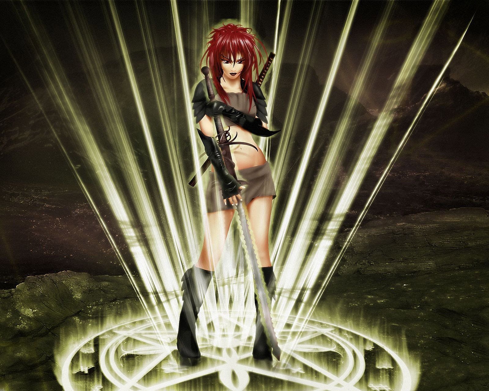 Скачать обои для рабочего стола Девочка с мечом на световом знаке и фото