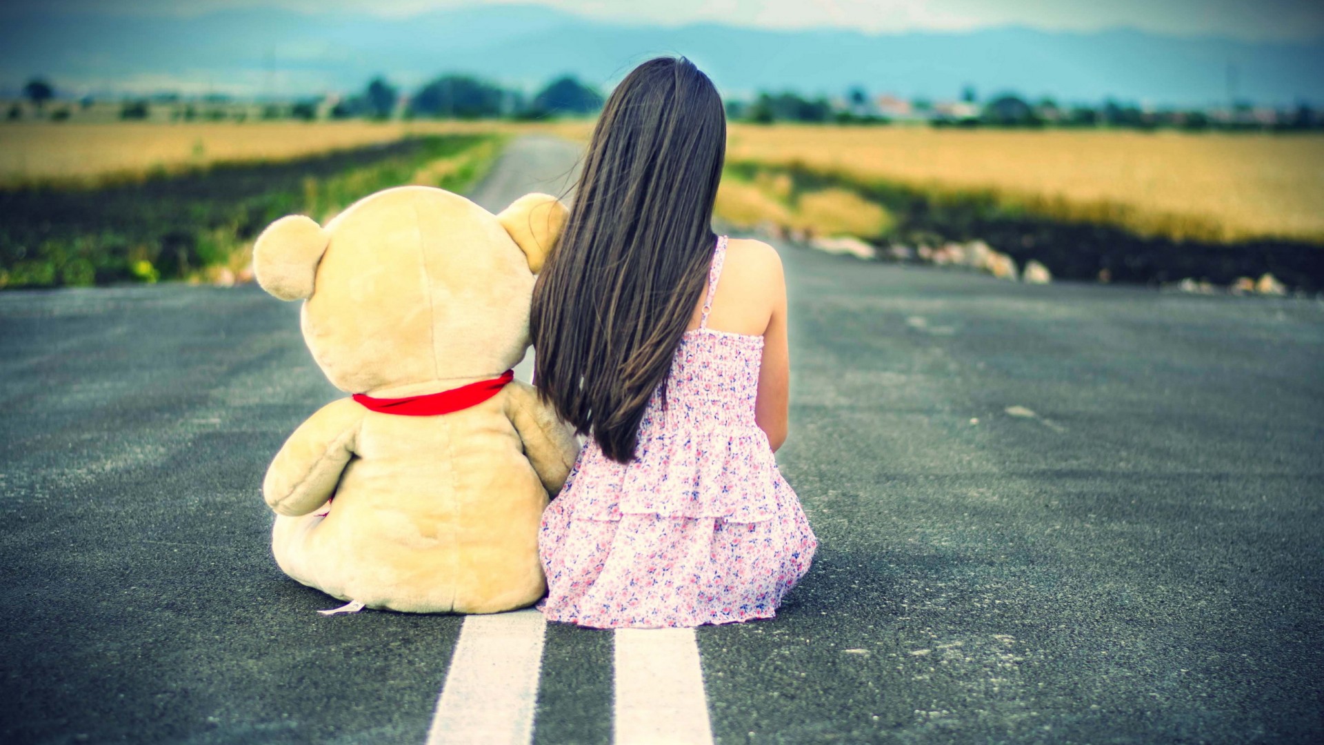 Скачать обои для рабочего стола Девочка с медвежонком на дороге и фото