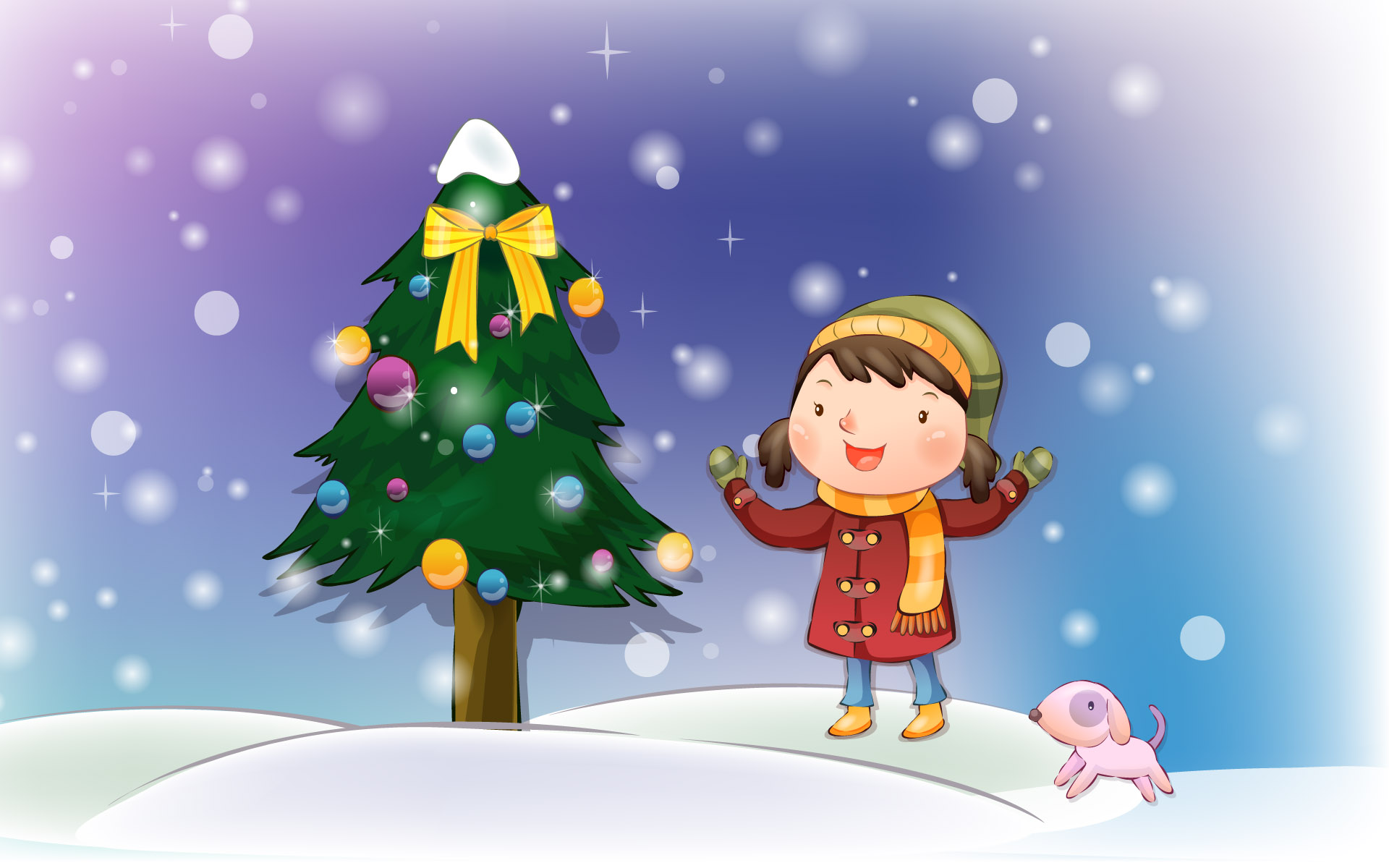 Скачать обои для рабочего стола Девочка стоящая рядом с елкой и радующаяся Новому году и фото