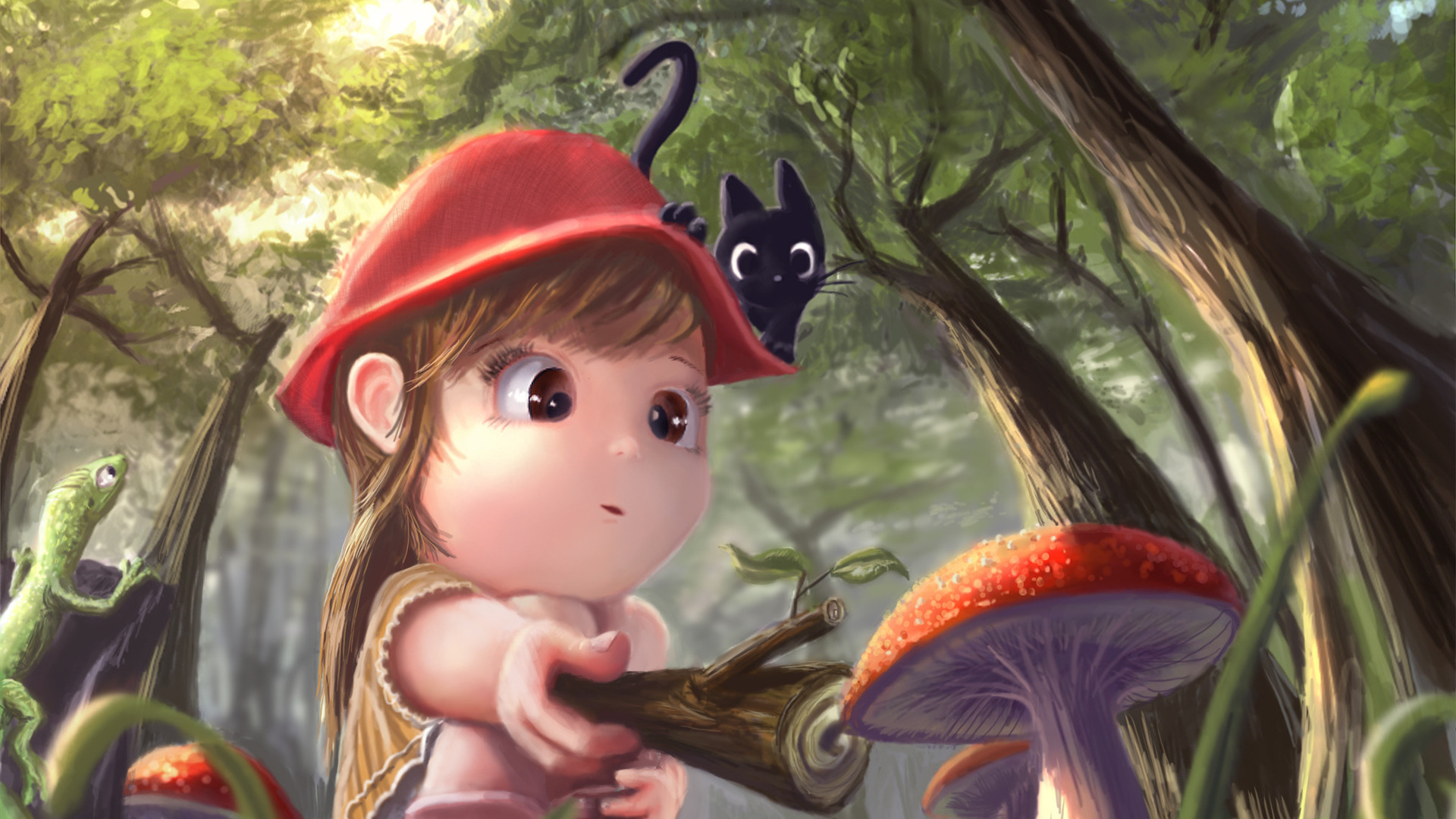 Скачать обои для рабочего стола Девочка в красной шапочке на природе и фото