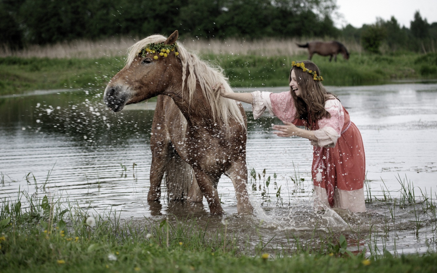 Скачать обои для рабочего стола Девушка и лошадь в веночках и фото