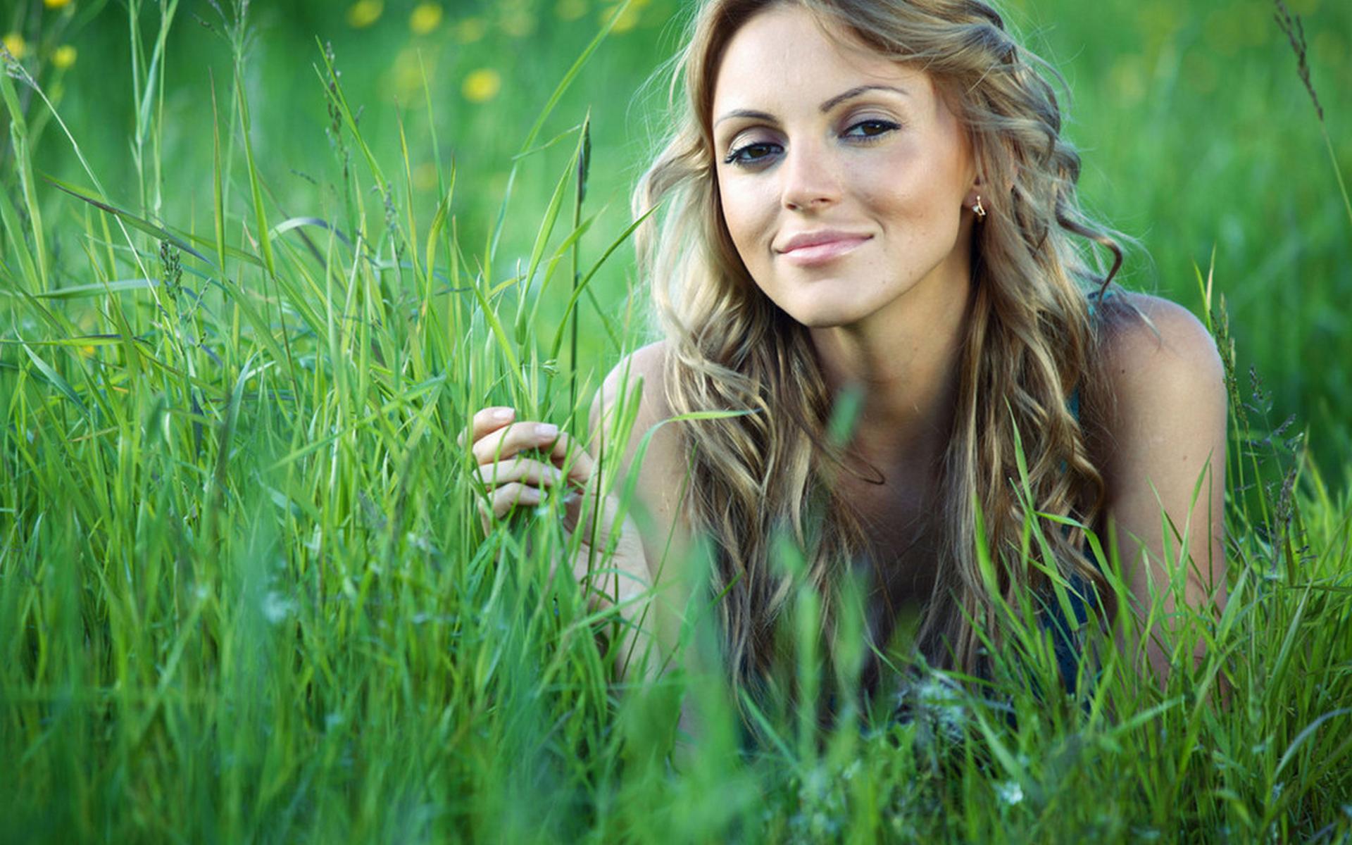 Скачать обои для рабочего стола Девушка и зеленая трава и фото