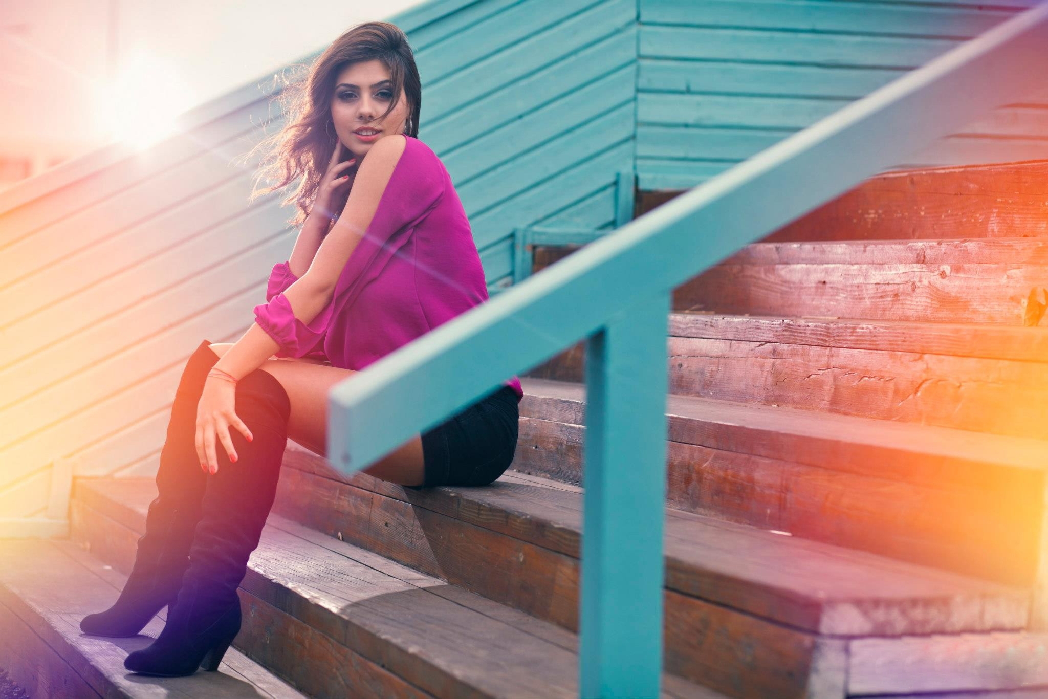 Похожие обои на Девушка на деревянных ступеньках сидит: