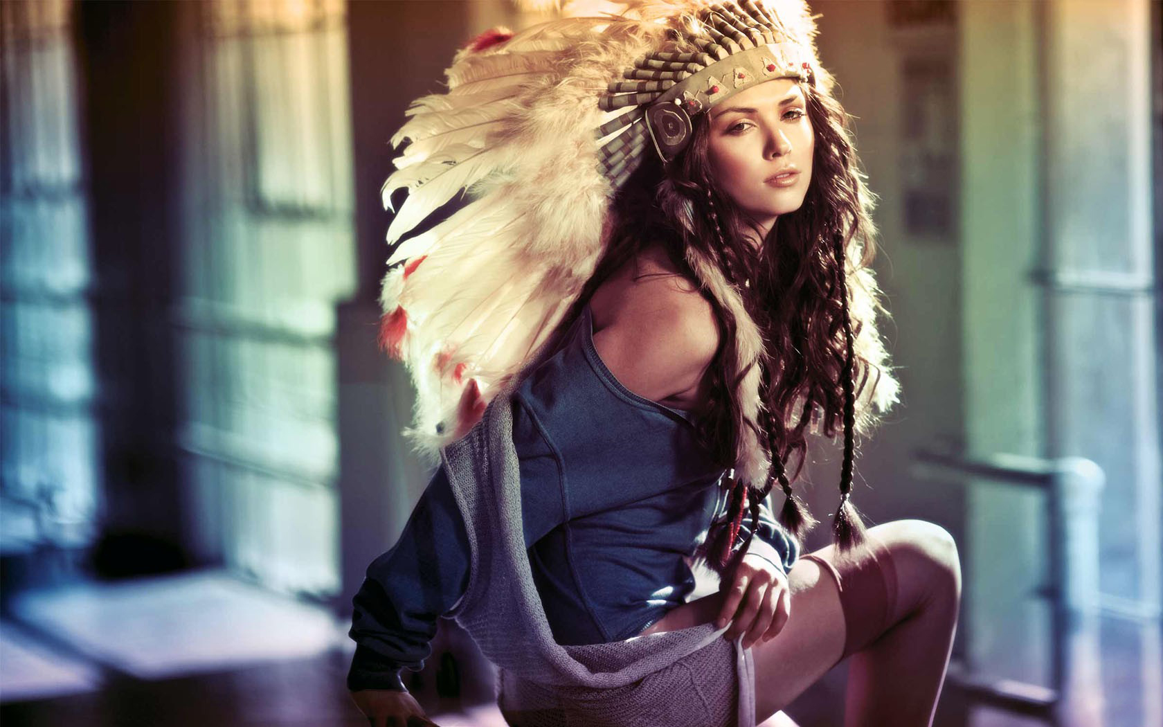 Скачать обои для рабочего стола Девушка на голове с убором индианцев и фото