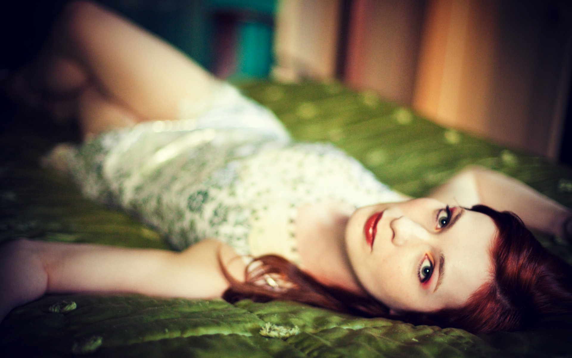 Скачать обои для рабочего стола Девушка на кровати в платье и фото