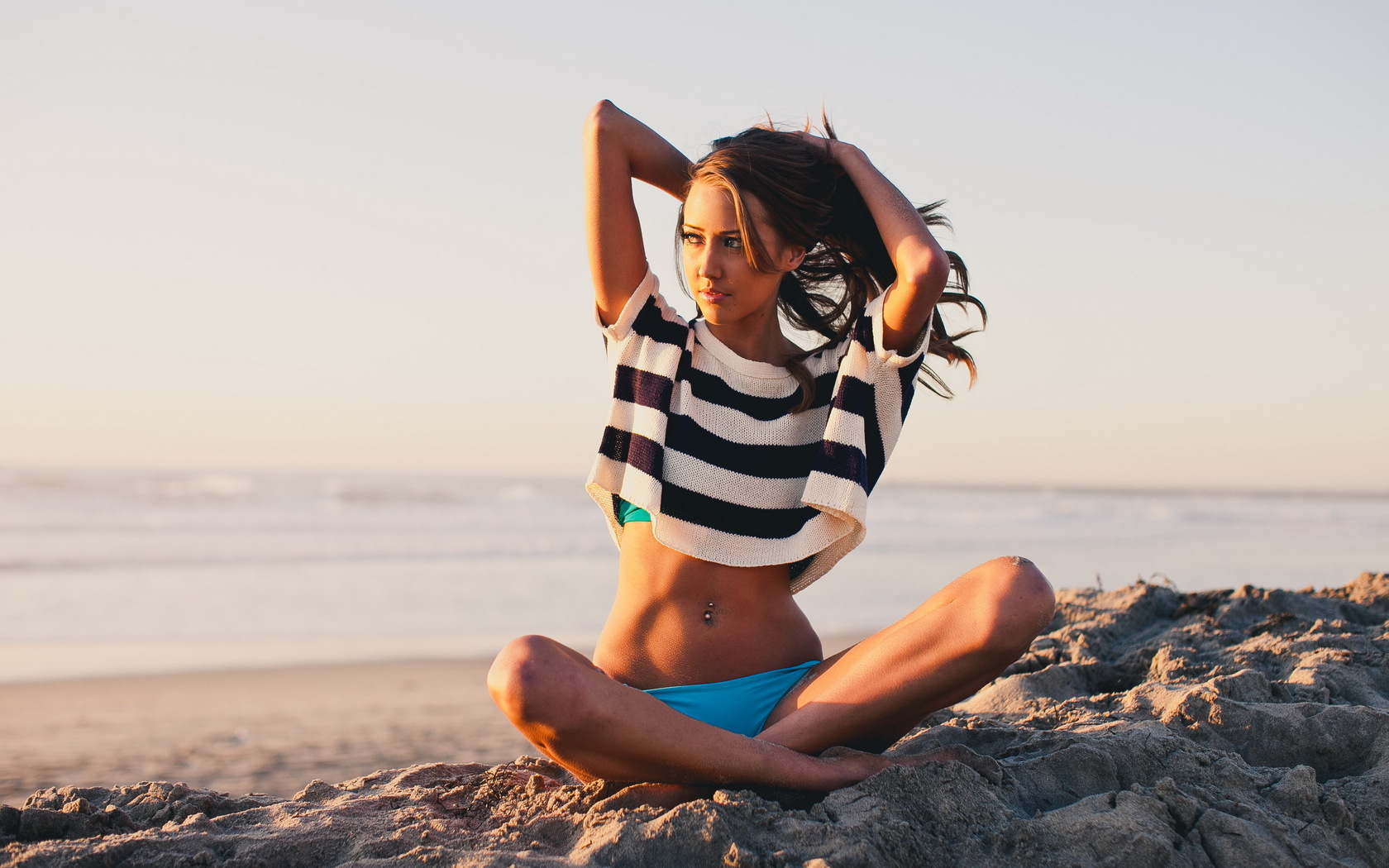 Скачать обои для рабочего стола Девушка на пляже на закате и фото