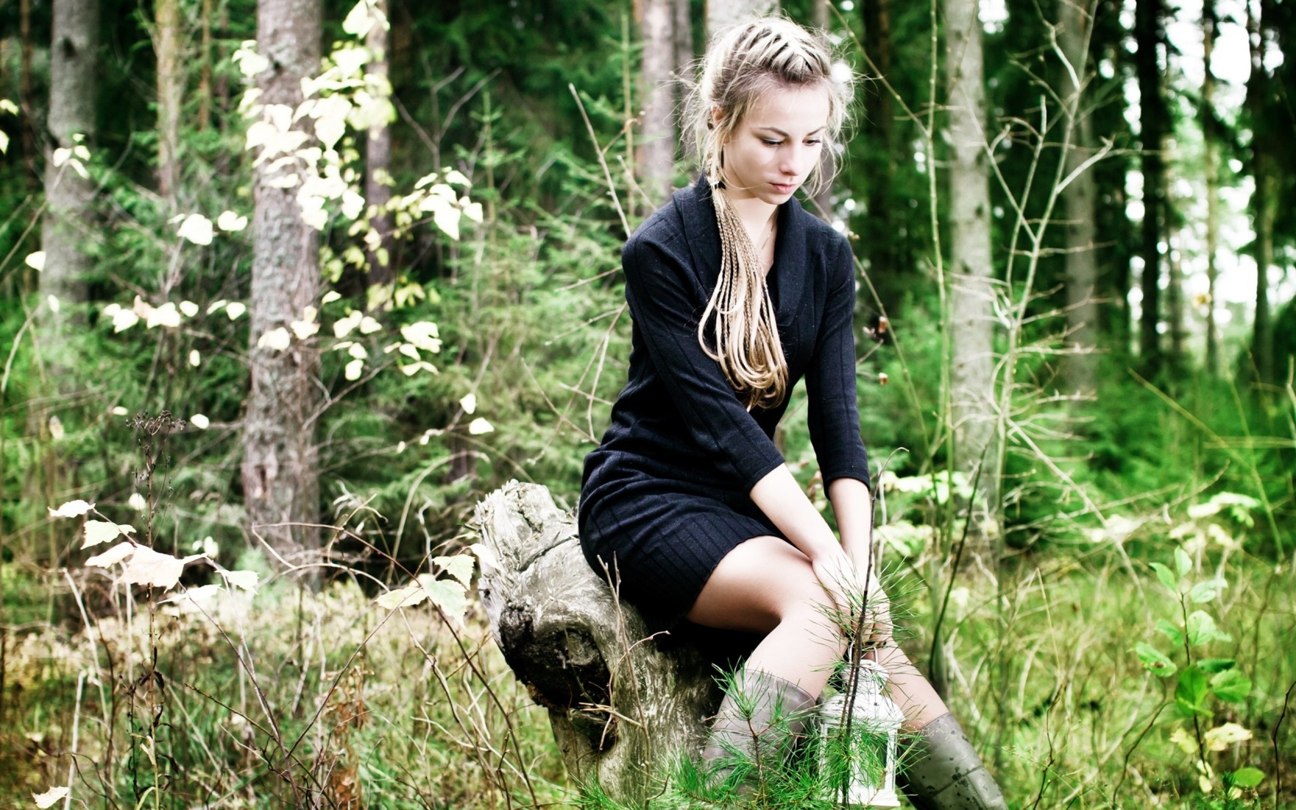 Скачать обои для рабочего стола Девушка на пне в сосновом лесу и фото