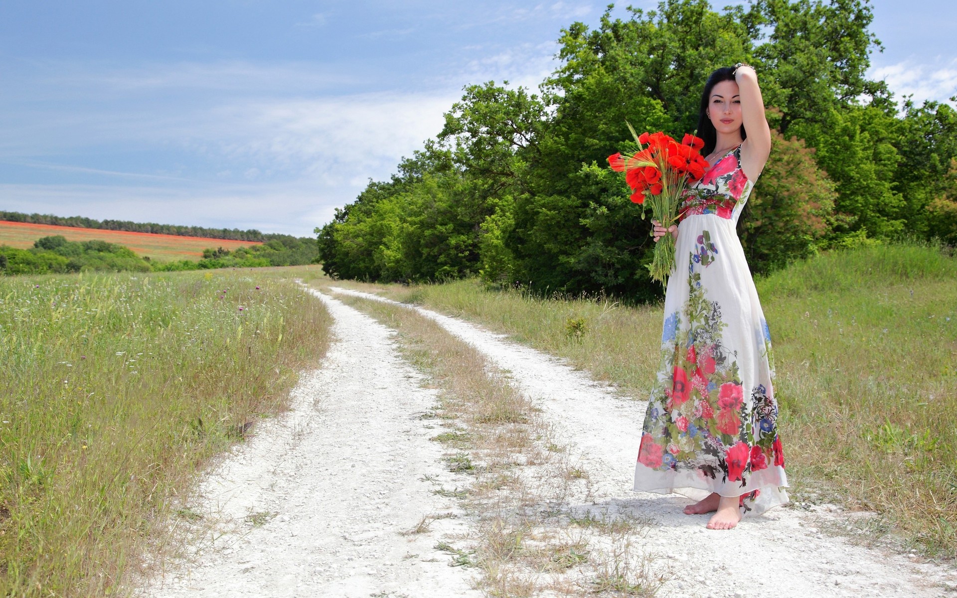 Скачать обои для рабочего стола Девушка на природе с букетом цветов и фото