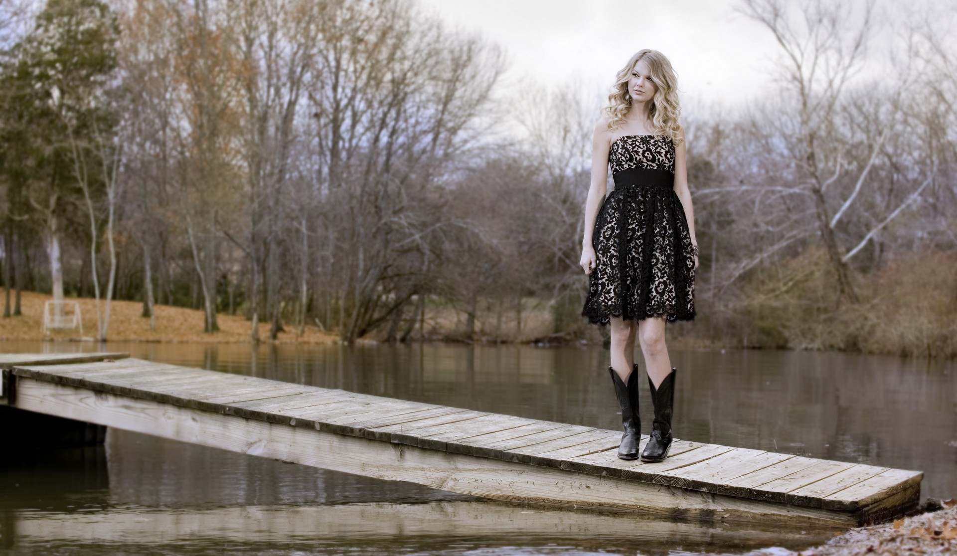 Скачать обои для рабочего стола Девушка на пруду в сарафане и сапогах и фото