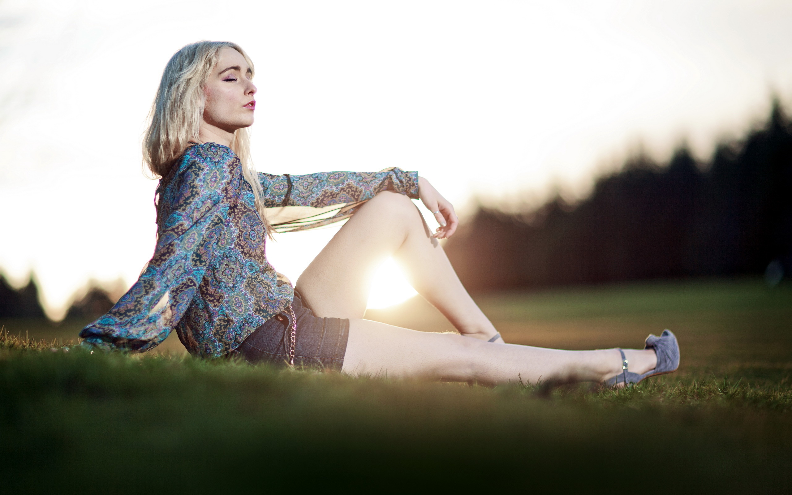 Скачать обои для рабочего стола Девушка расслабляется сидя на траве и фото