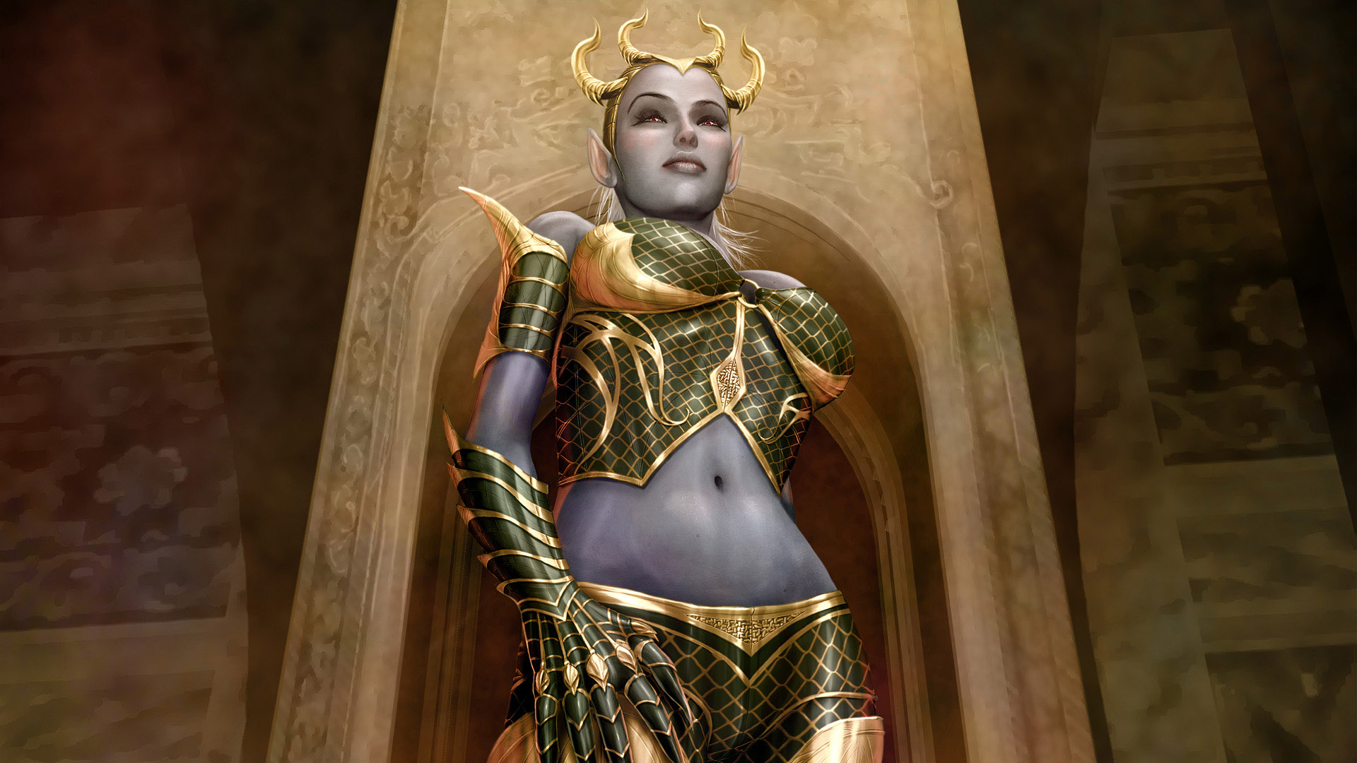 Скачать обои для рабочего стола Девушка с голубым телом в доспехах и фото