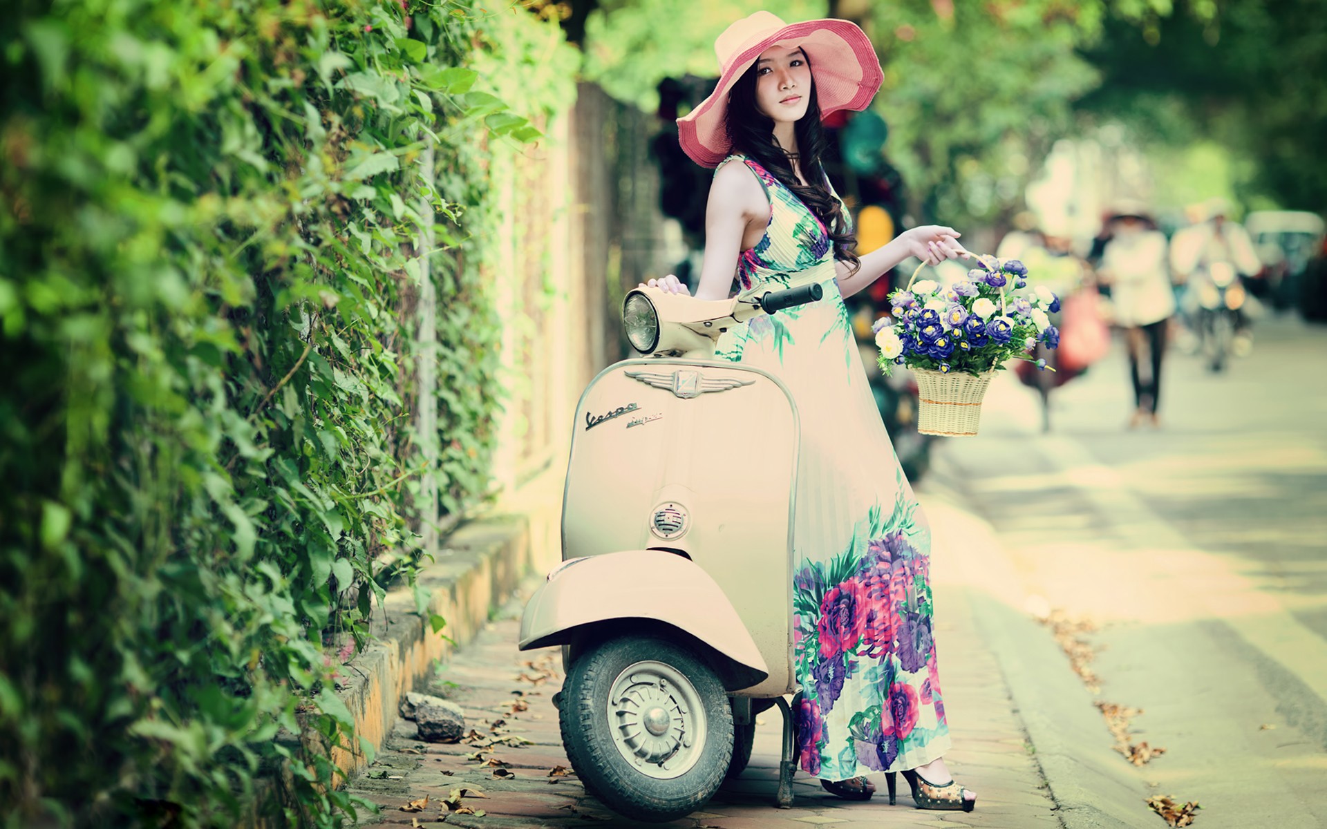 Похожие обои на Девушка с корзинкой цветов у мотоцикла: