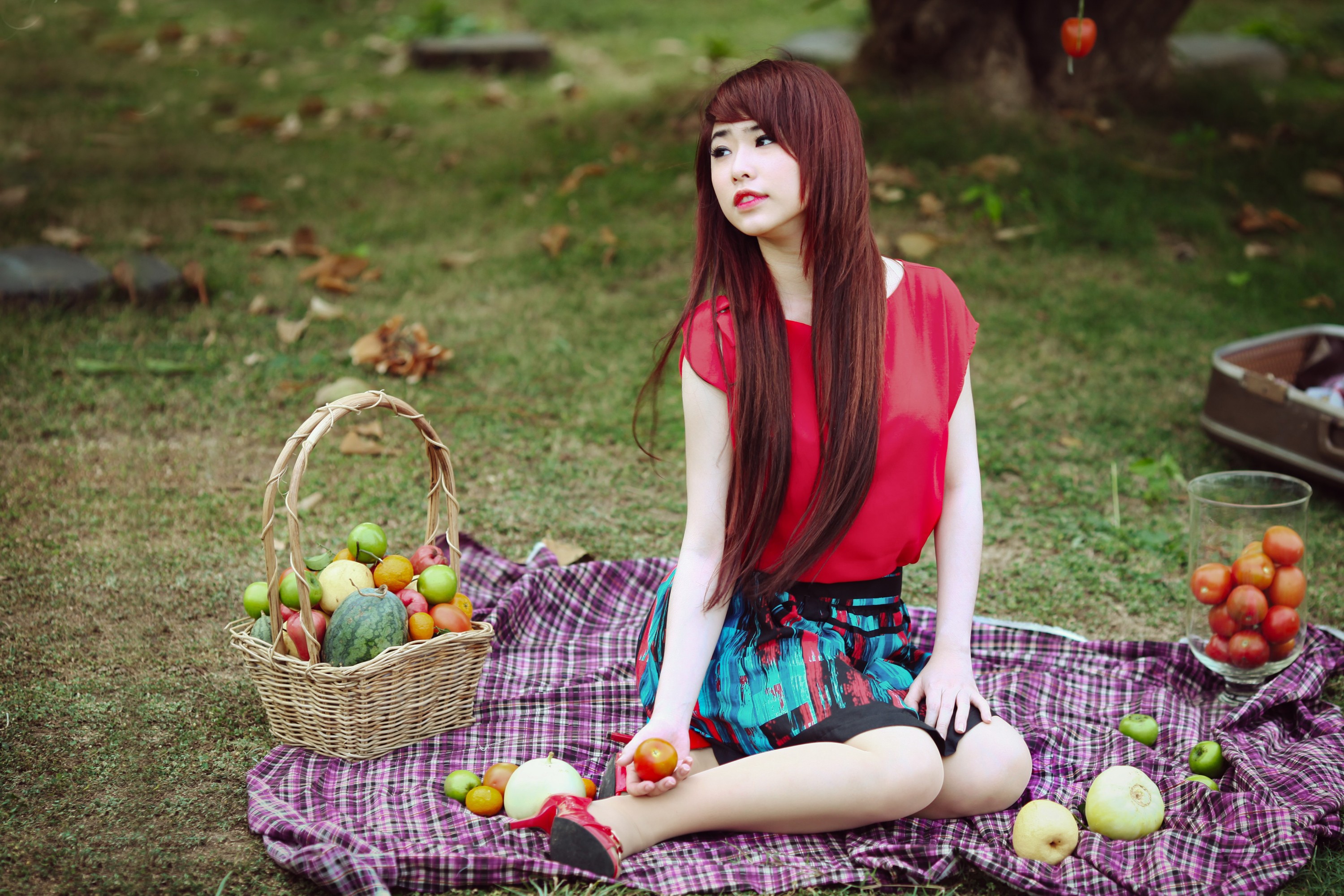 Скачать обои для рабочего стола Девушка с овощами на покрывале и фото