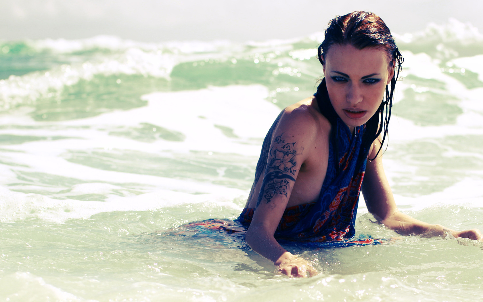Скачать обои для рабочего стола Девушка с тату в море и фото
