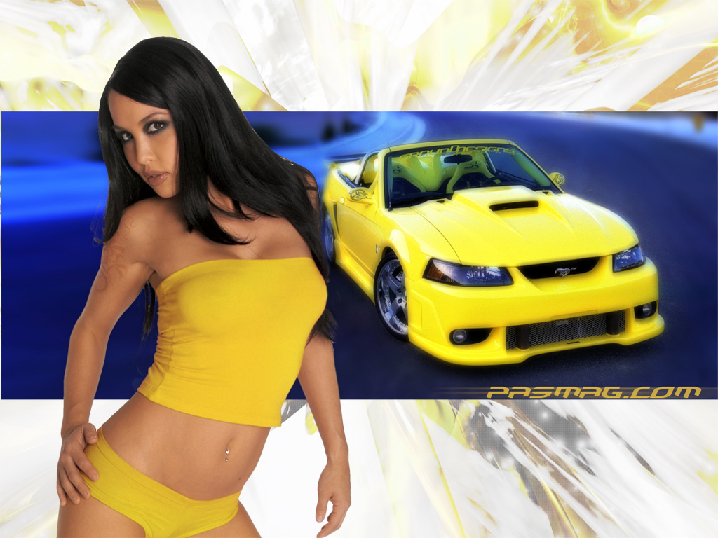 Скачать обои для рабочего стола Девушка с желтым Мустангом и фото