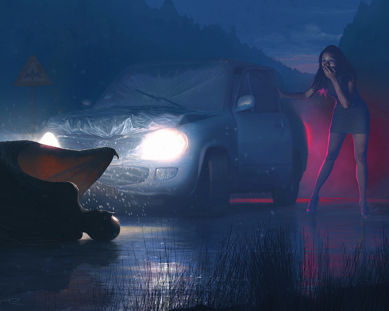 Обои Девушка сбила на авто странное существо