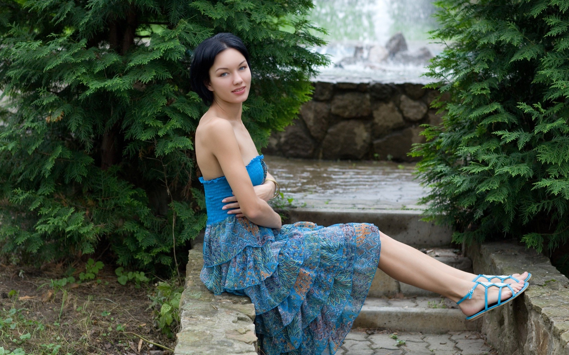 Скачать обои для рабочего стола Девушка сидит в синем платье и фото