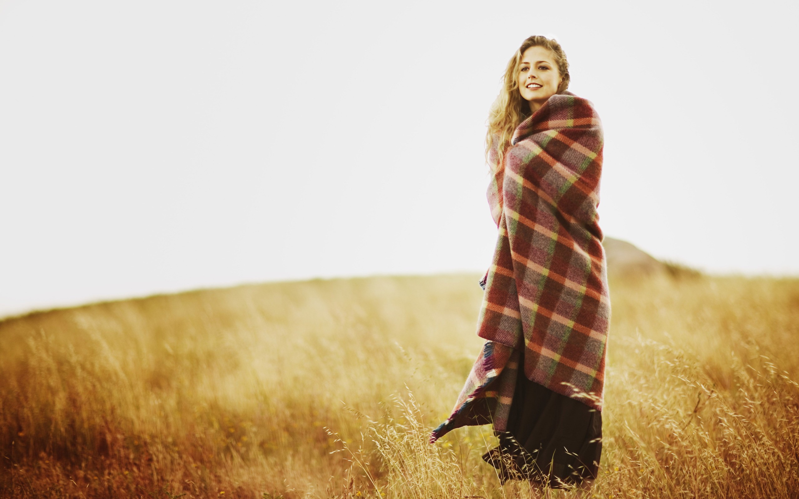 Обои Девушка укуталась в одеяло на поле