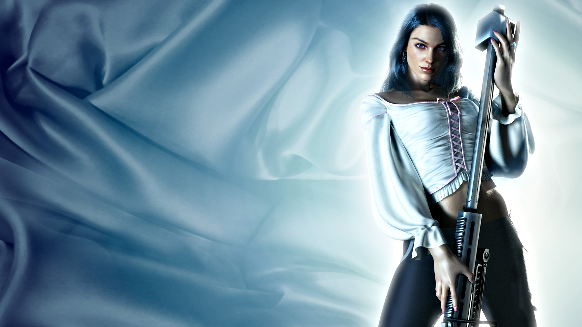 Обои Девушка в белой блузе с оружием