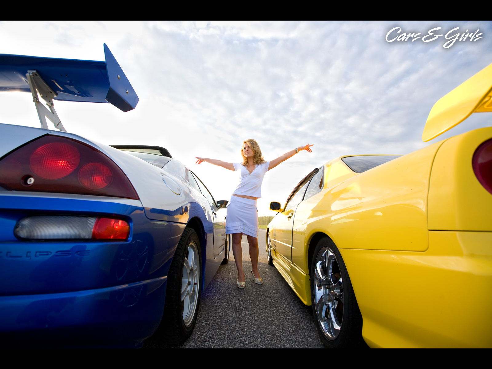Скачать обои для рабочего стола Девушка в белом около машин и фото