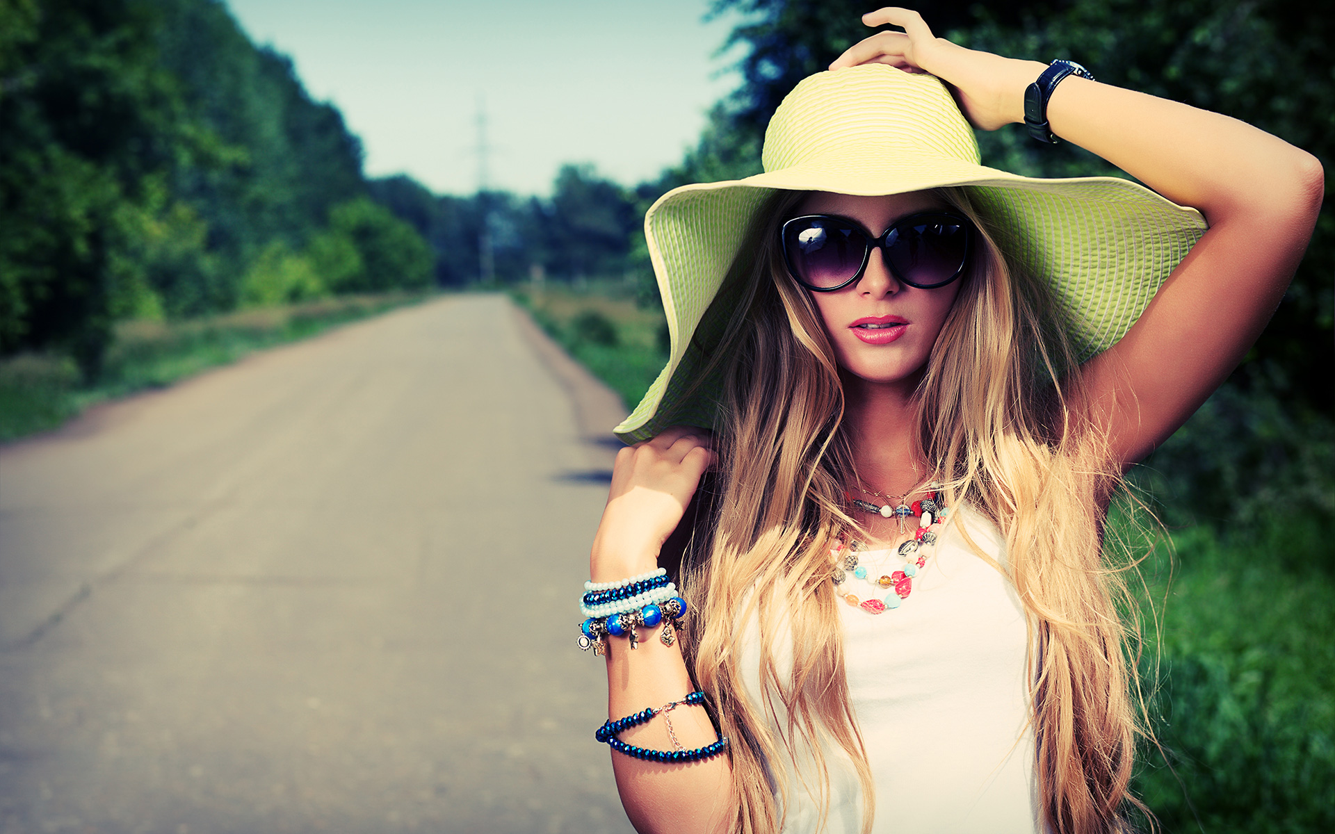 Похожие обои на Девушка в больших очках придерживает шляпу: