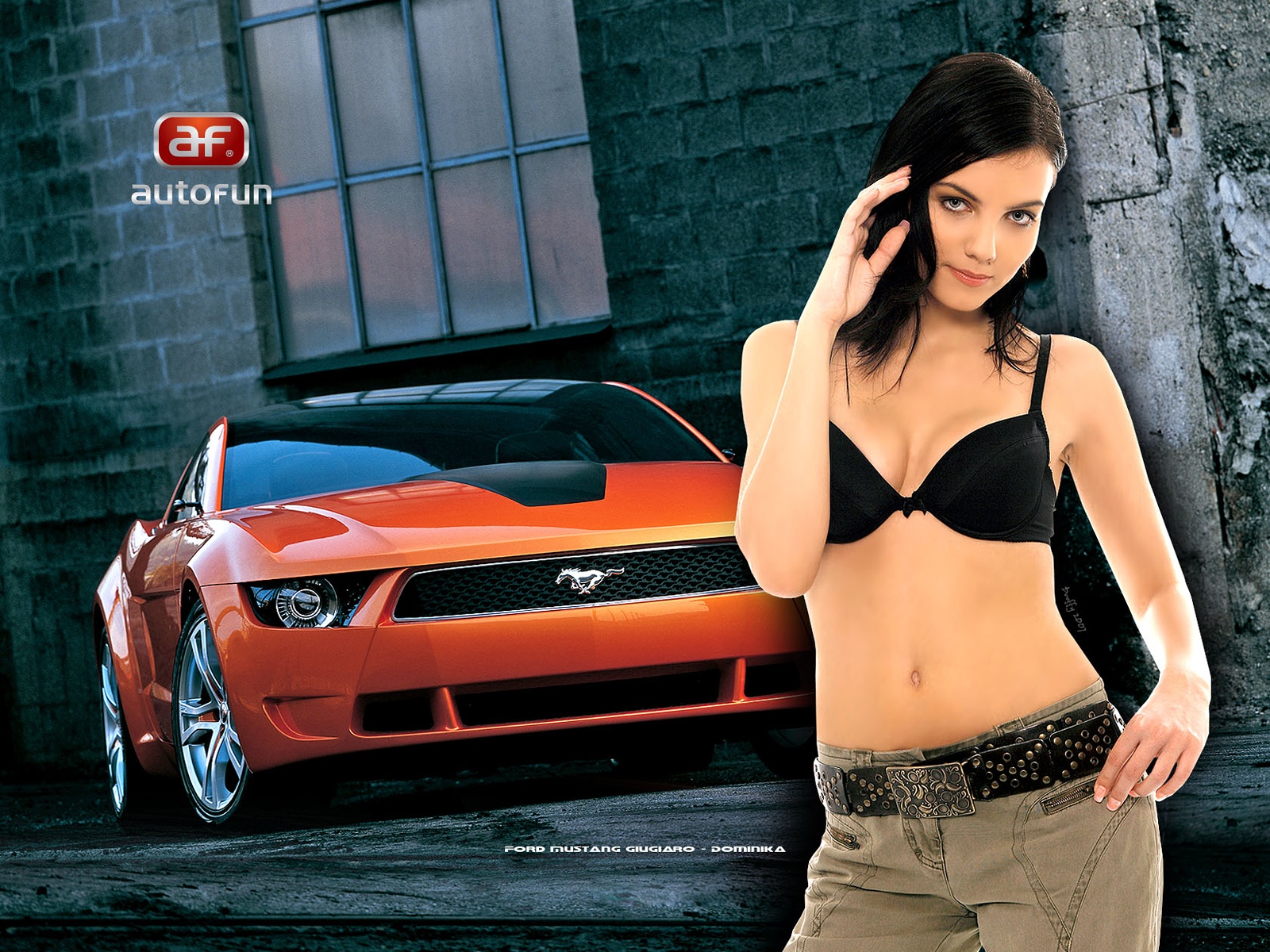 Скачать обои для рабочего стола Девушка в черном белье на фоне машины и фото