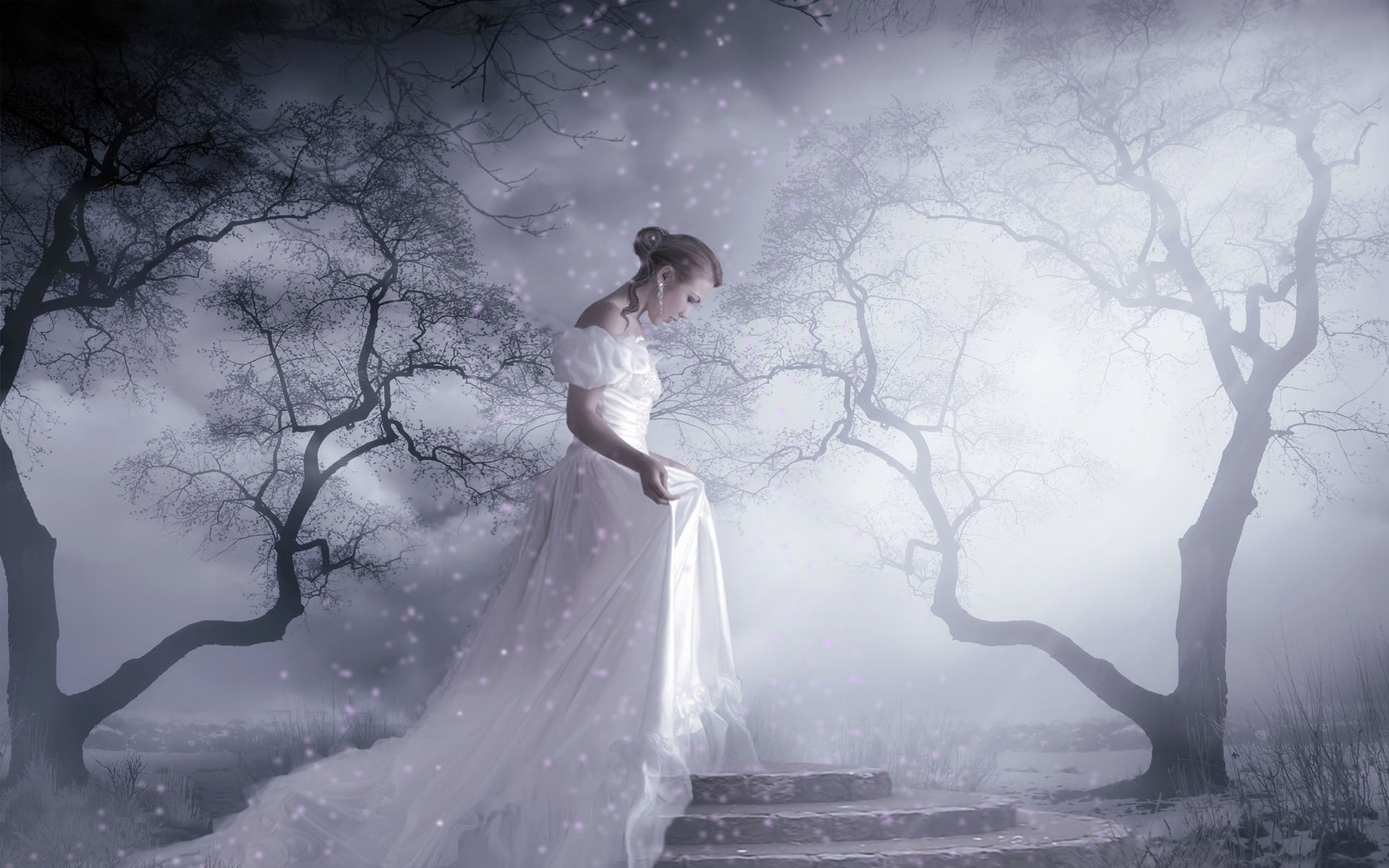 Скачать обои для рабочего стола Девушка в длинном белом платье и фото