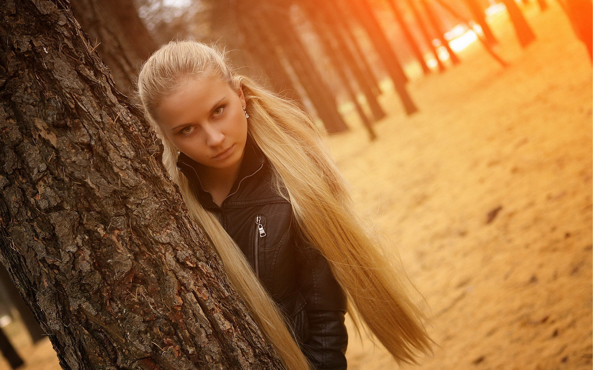 Скачать обои для рабочего стола Девушка в куртке у ствола дерева и фото