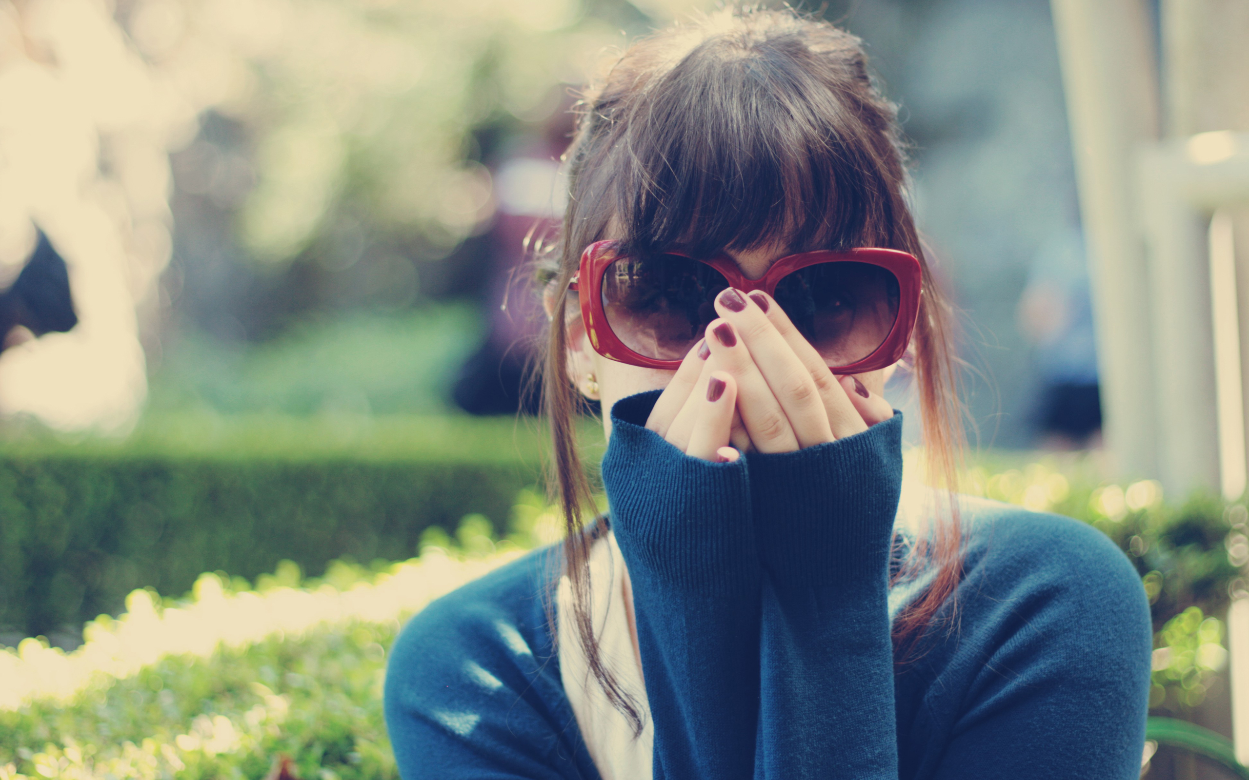 Обои Девушка в очках прикрыла руками нос