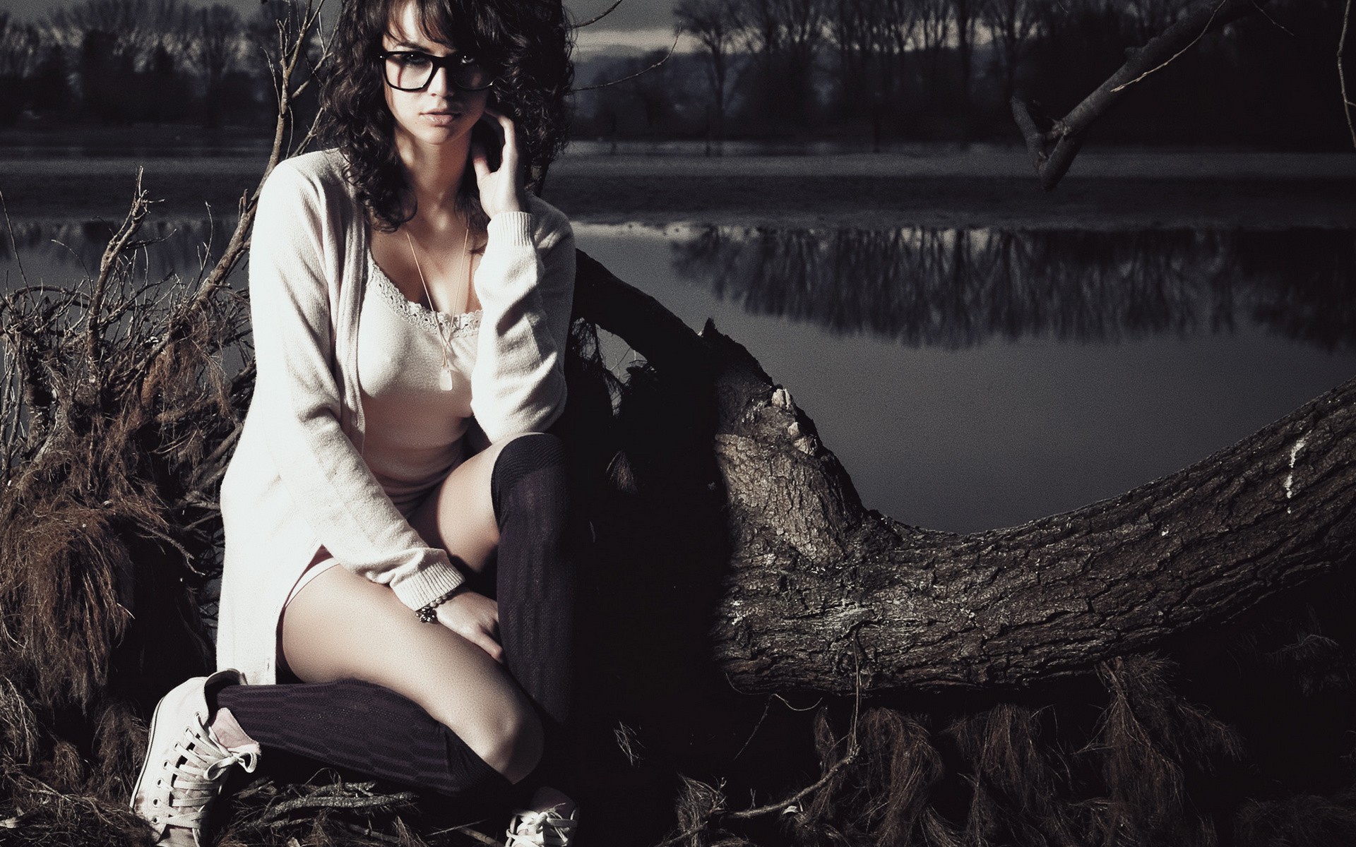 Обои Девушка в очках возле упавшего дерева