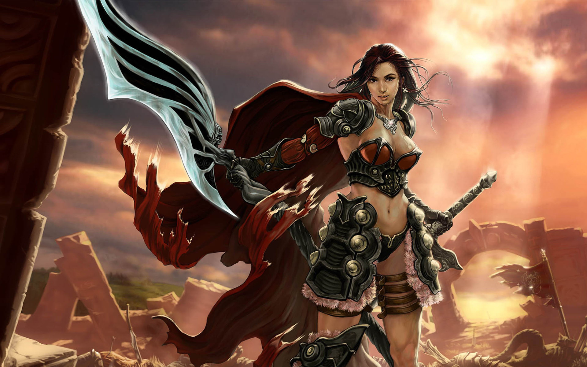 Скачать обои для рабочего стола Девушка воительница стоит с топором и мечом и фото