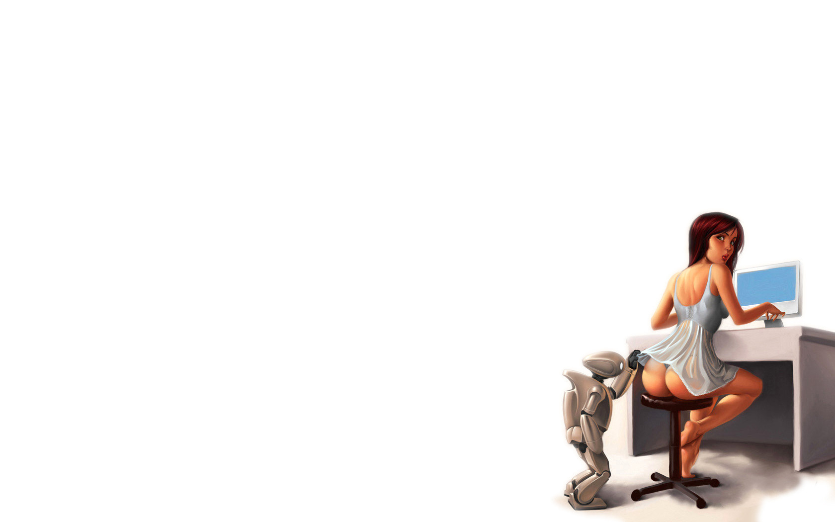 Скачать обои для рабочего стола Девушка за компьютером а робот подглядывает и фото