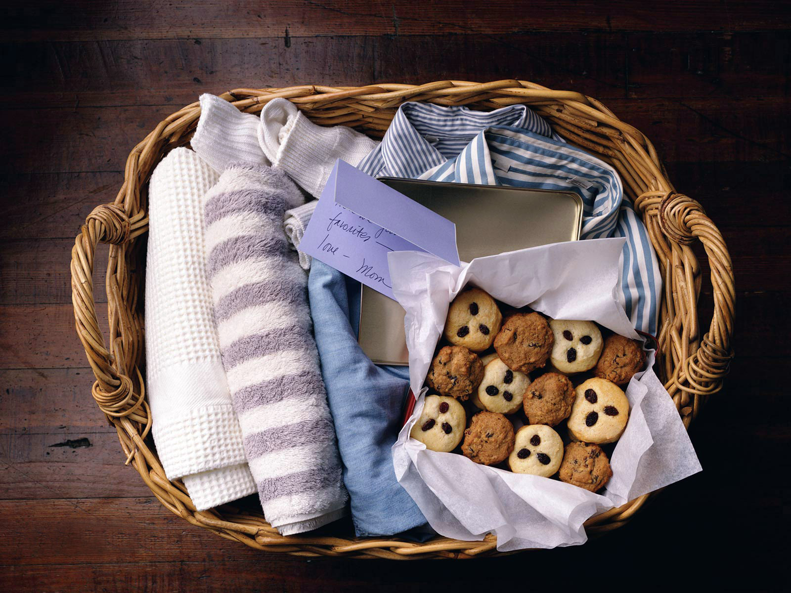 Скачать обои для рабочего стола Домашнее печенье в корзине с вещами и фото