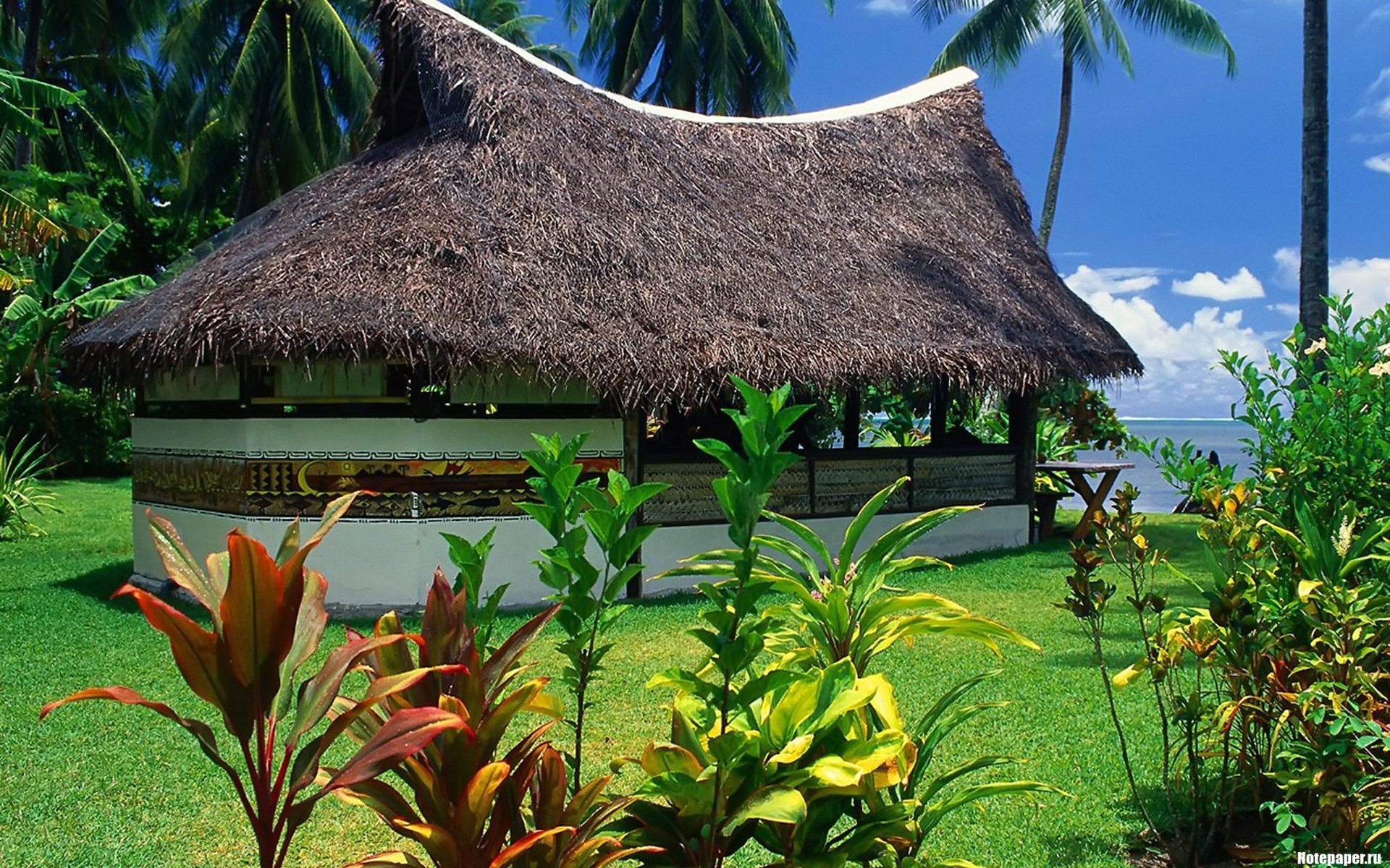 Скачать обои для рабочего стола Домик для отдыха с цветами и пальмами и фото