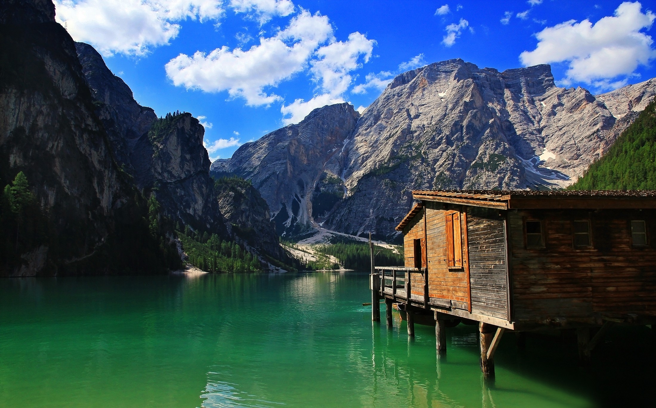 Скачать обои для рабочего стола Домик на озере в гoрах и фото