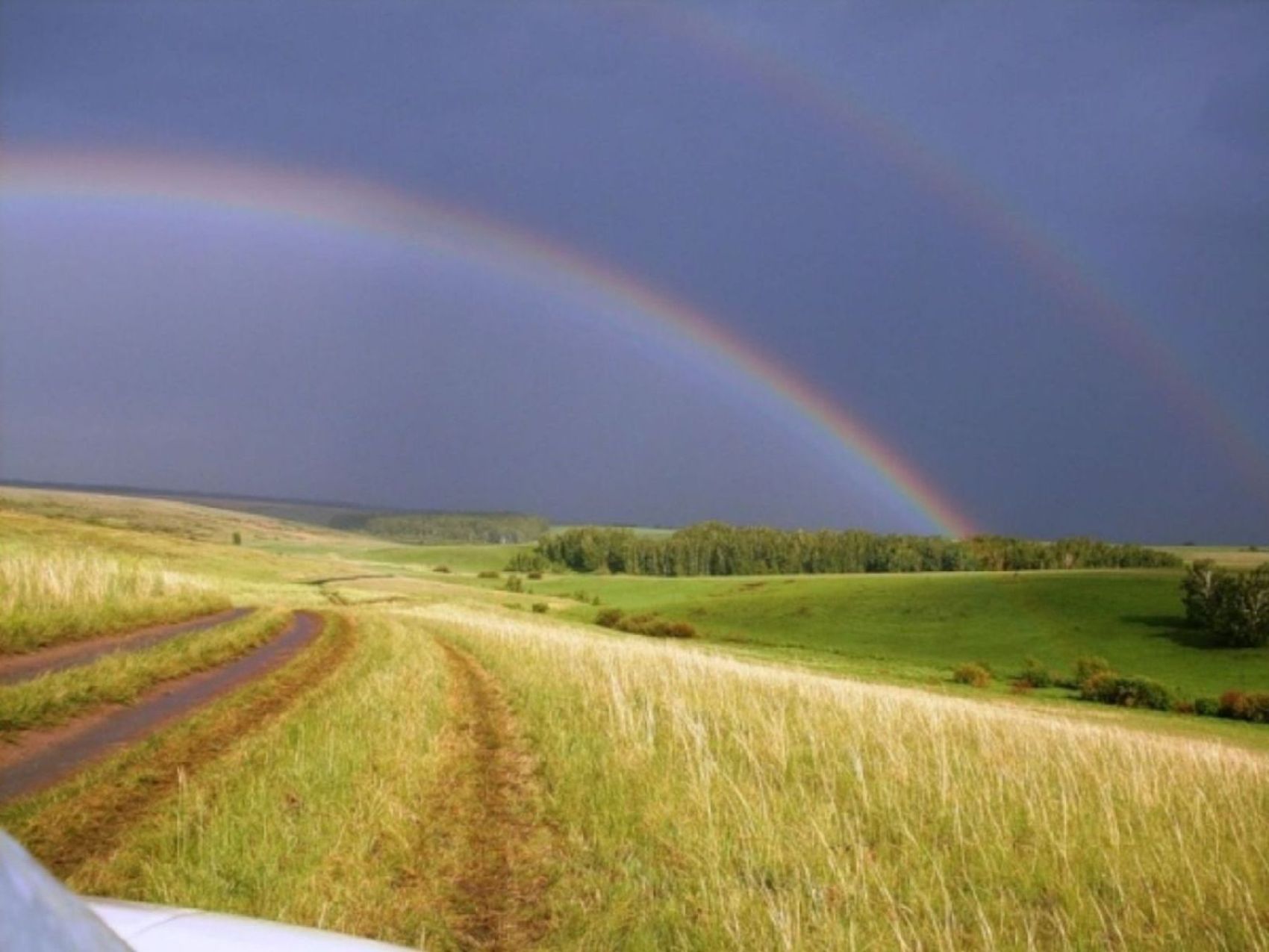 Скачать обои для рабочего стола Дорога в поле под радугой и фото