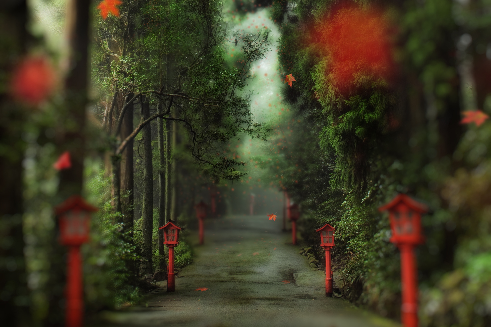 Обои Дорожка с красными фонарями ранней осенью