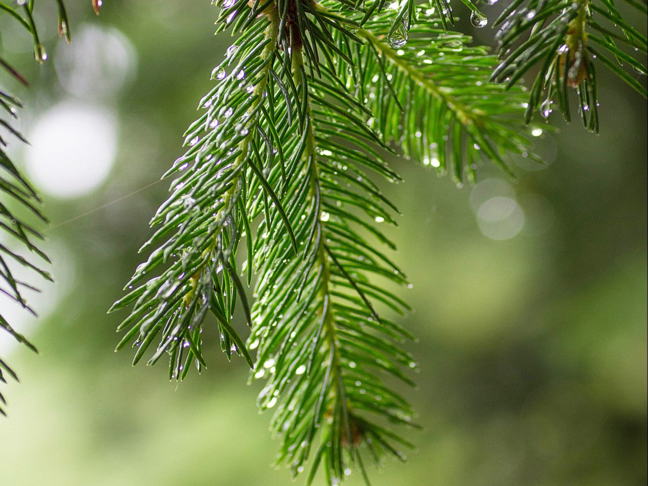 Скачать обои для рабочего стола Дождевые капли на еловой ветке и фото