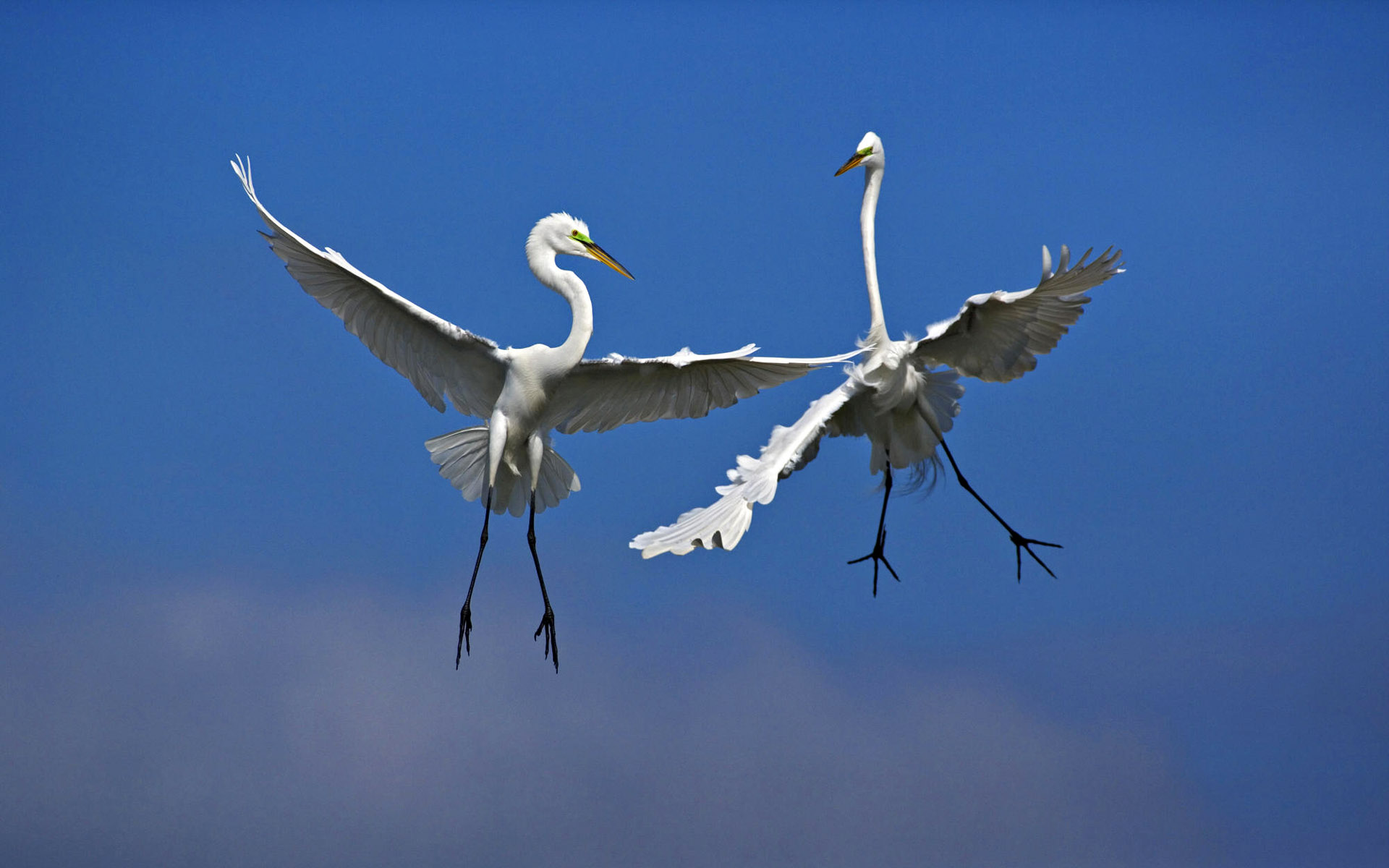 Скачать обои для рабочего стола Два аиста в небесном танце и фото