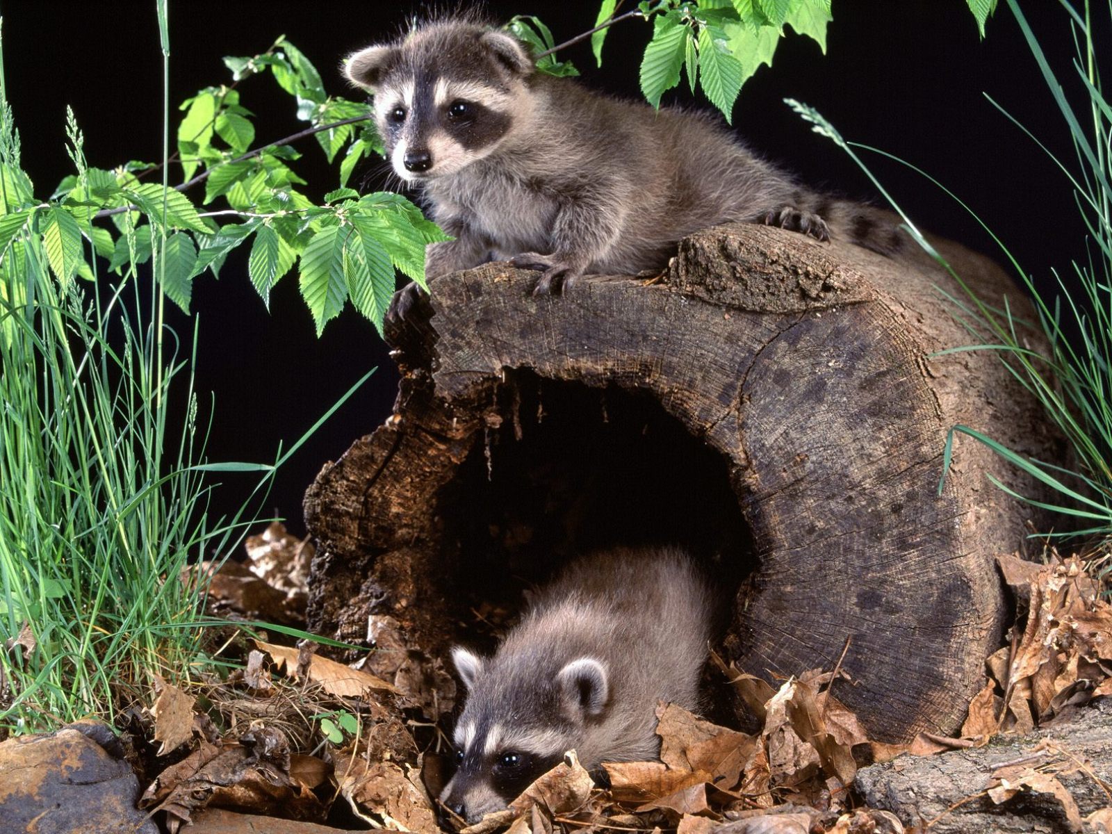 Скачать обои для рабочего стола Два енотика у дерева и фото