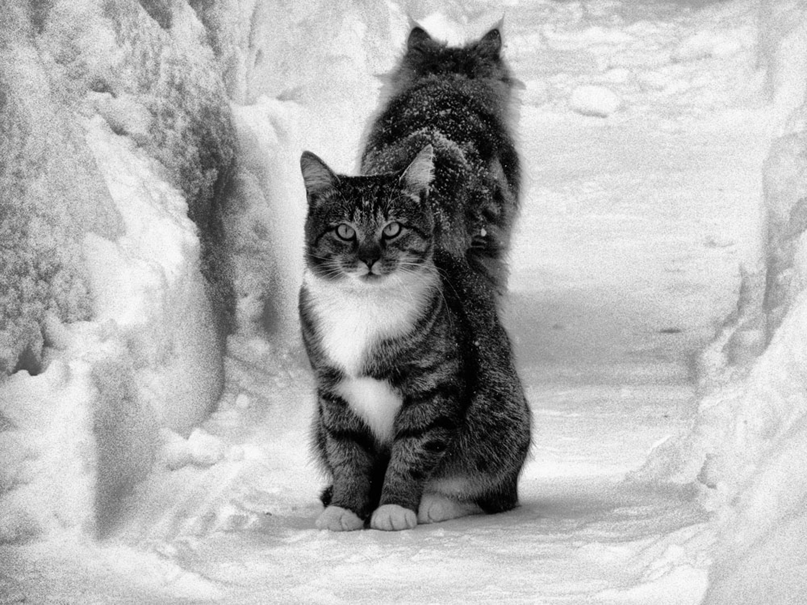 Скачать обои для рабочего стола Два кота на снежной дорожке и фото