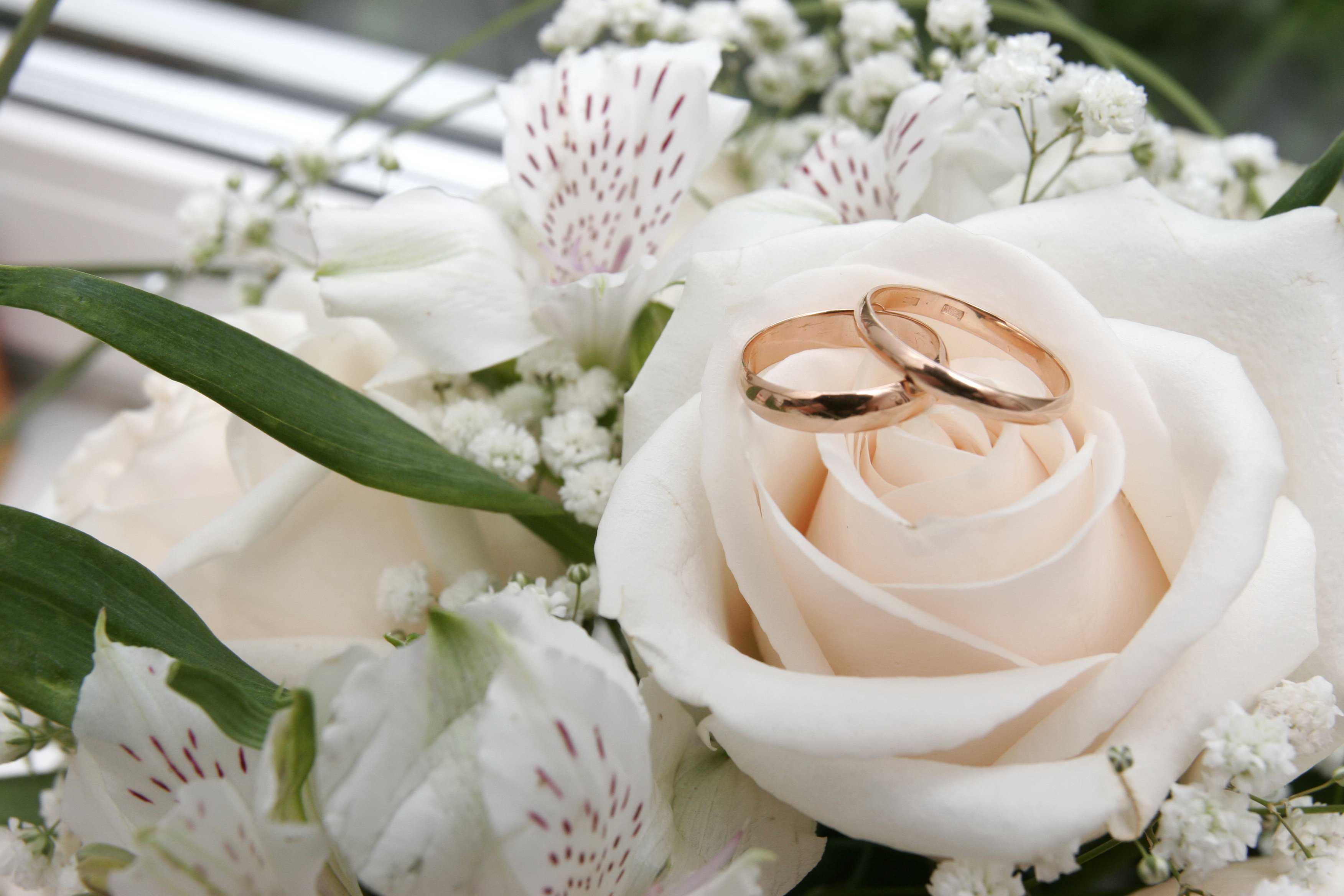 Скачать обои для рабочего стола Два обручальных кольца на белоснежном бутоне и фото